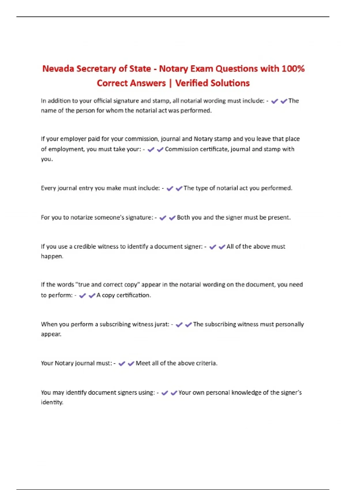 Nevada Secretary of State - Notary Exam Questions with 100% Correct Answers | Verified Solutions