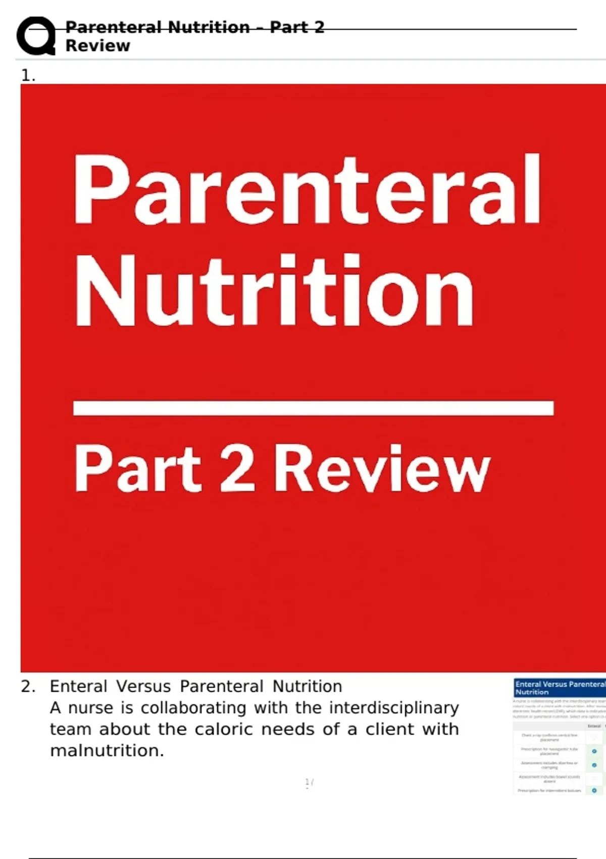 Deepen your understanding of Parenteral Nutrition with this Part 2 review, designed to help nursing and healthcare students master advanced concepts and clinical applications. This resource builds on foundational knowledge, covering key principles, administration techniques, patient monitoring, and complication management. Each section is structured to reinforce critical thinking, strengthen exam readiness, and prepare you for real‑world practice. Ideal for exam prep or professional development, this guide ensures you have the confidence and expertise to deliver safe, effective parenteral nutrition care