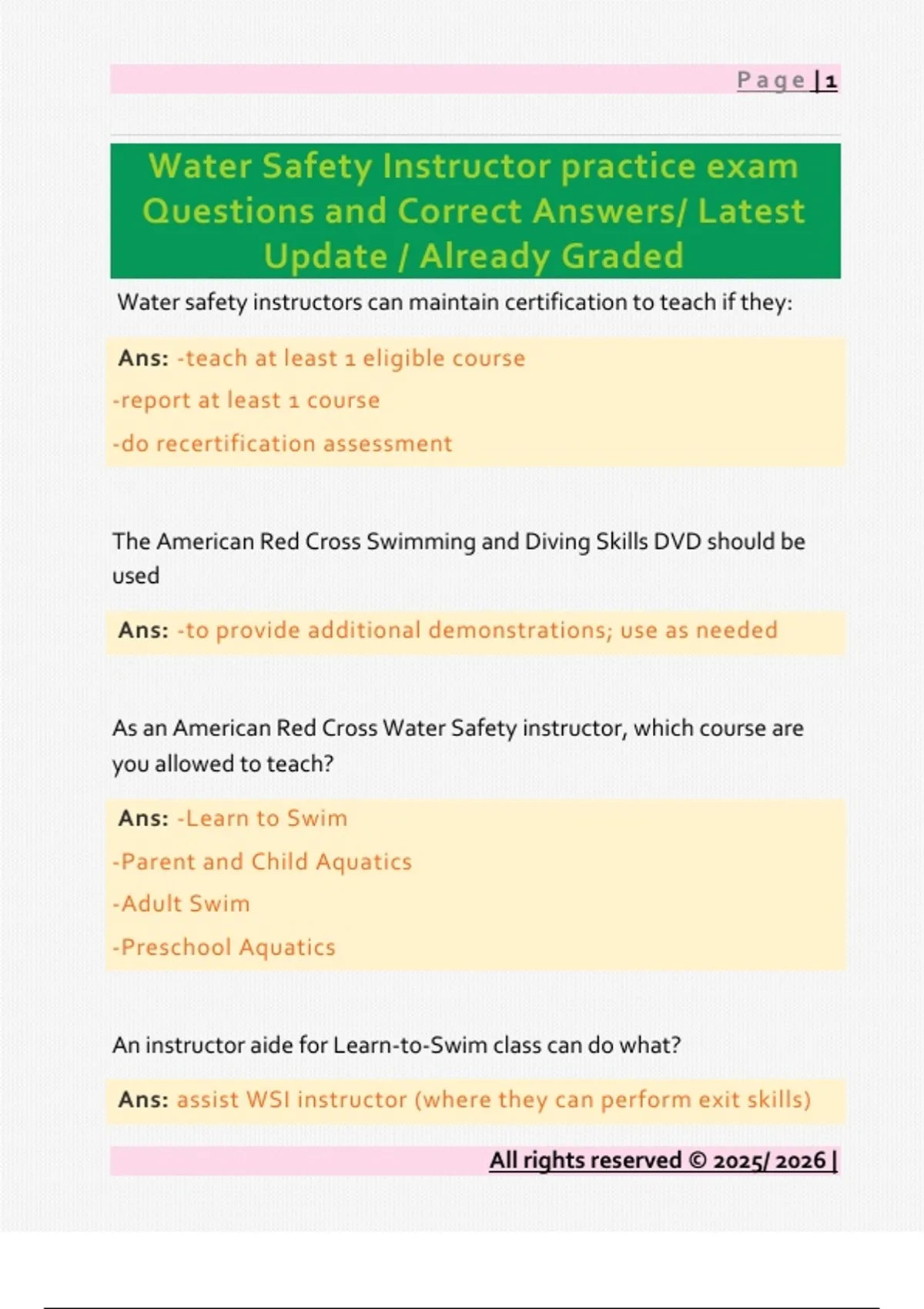Water Safety Instructor practice exam Questions and Correct Answers/ Latest Update / Already Graded