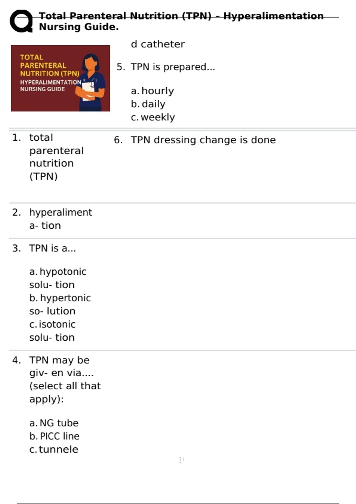 Learn the essentials of Total Parenteral Nutrition (TPN), also known as hyperalimentation, with this comprehensive nursing guide. Designed for nursing students and NCLEX candidates, this resource explains the principles, indications, and administration of TPN, along with patient monitoring and complication management. Build your understanding of parenteral nutrition protocols, improve your clinical decision‑making, and prepare confidently for nursing school exams and the NCLEX. Perfect for quick review or in‑depth study, this guide supports both classroom learning and clinical practice.