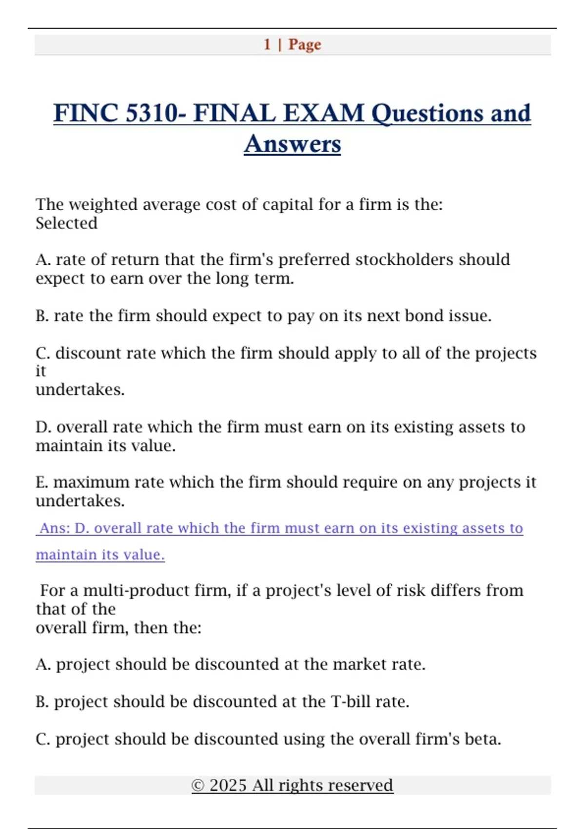FINC 5310- FINAL EXAM Questions and