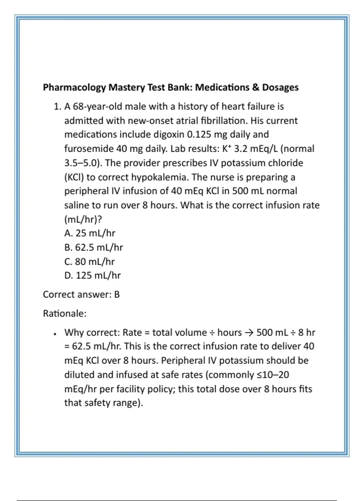, • Why distractors wrong: A (25 mL/hr) would deliver only