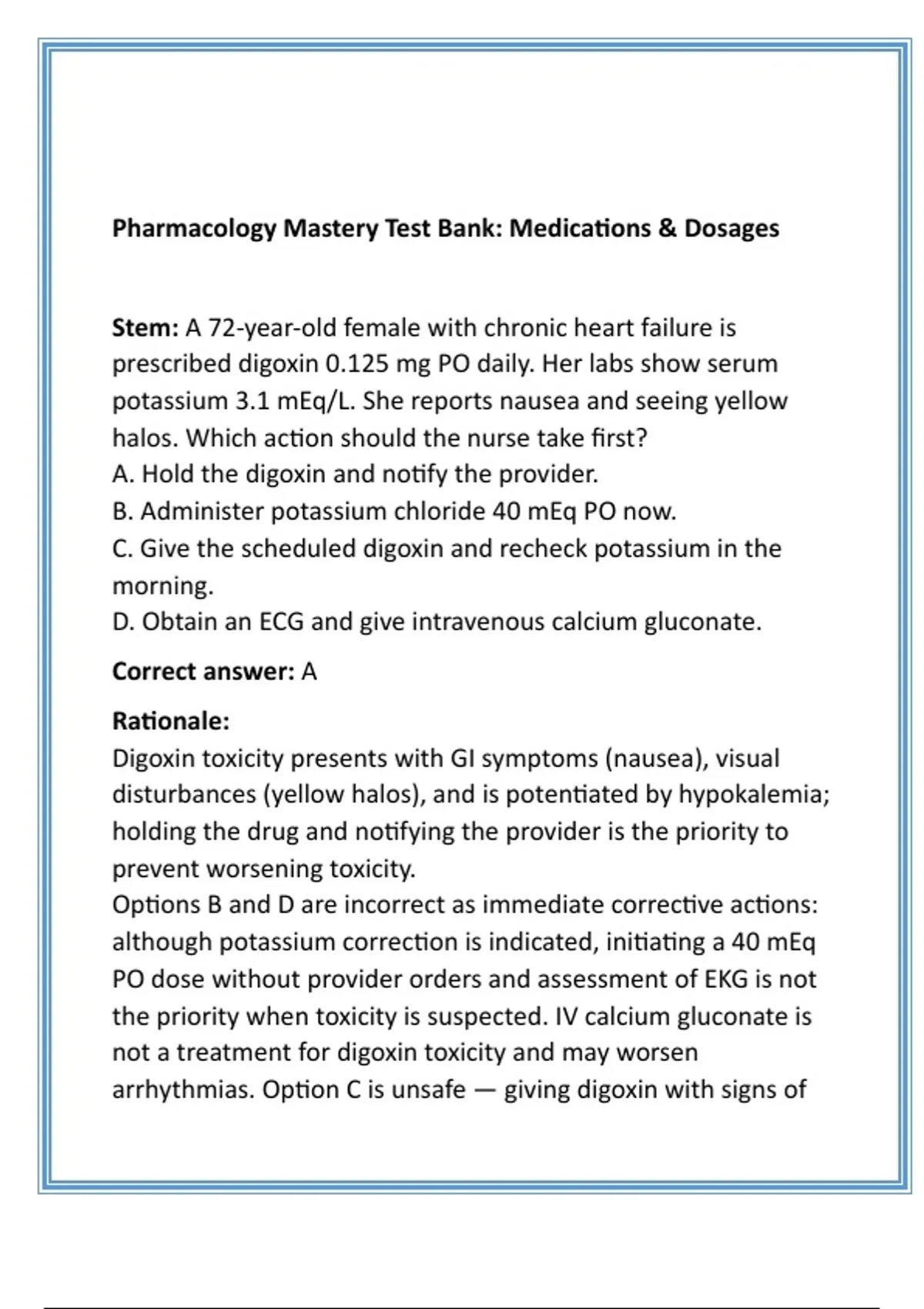 arrhythmias. Option C is unsafe — giving digoxin with signs of