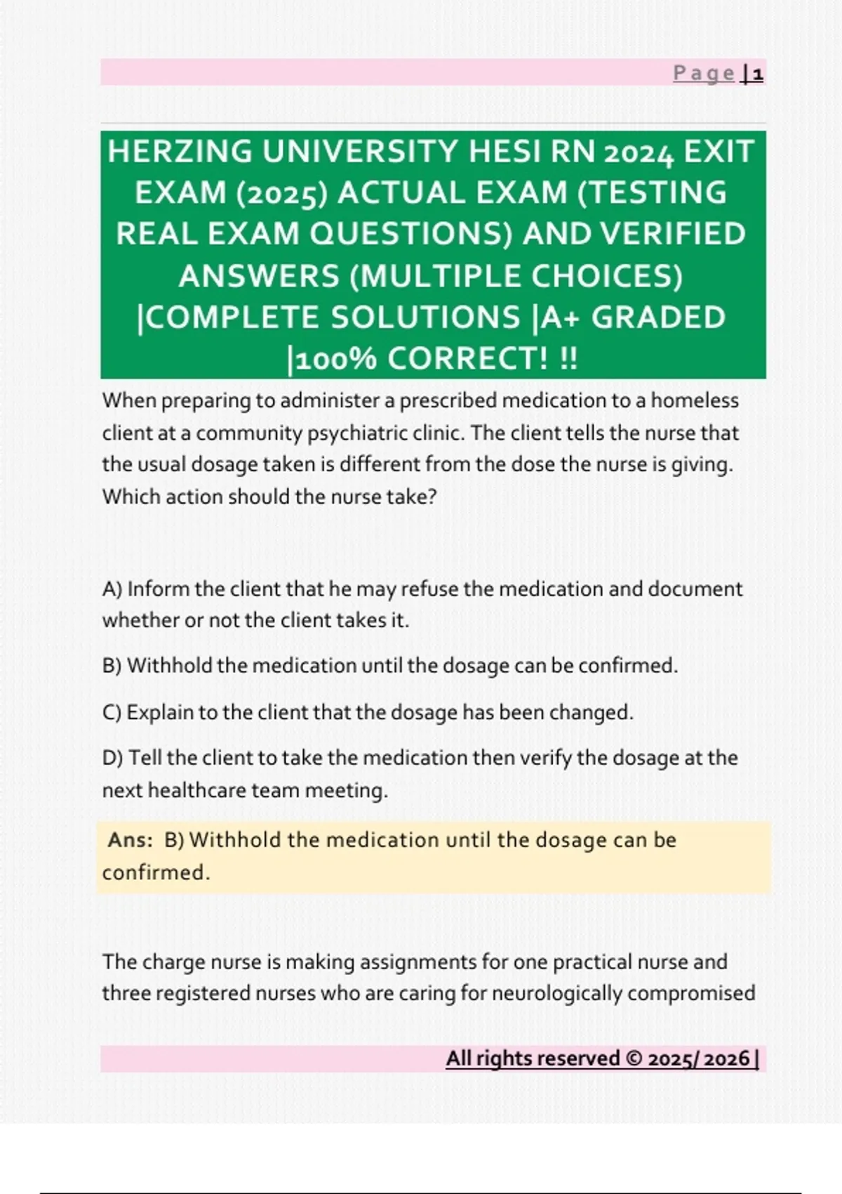 This document contains the actual HESI RN Exit Exam questions used at Herzing University, updated for 2024/2025. It includes multiple-choice questions with verified correct answers, complete solutions, and explanations to support exam readiness. All material is A+ graded and 100% accurate, making it a reliable study resource for nursing students preparing for the HESI RN Exit Exam.