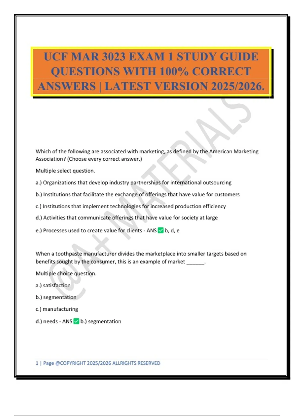 Which of the following are associated with marketing, as defined by the American Marketing Association? (Choose every correct answer.) Multiple select question. a.) Organizations that develop industry partnerships for international outsourcing b.) Institutions that facilitate the exchange of offerings that have value for customers c.) Institutions that implement technologies for increased production efficiency d.) Activities that communicate offerings that have value for society at large e.) Processes used to create value for clients - ANS b, d, e When a toothpaste manufacturer divides the marketplace into smaller targets based on benefits sought by the consumer, this is an example of market ______. Multiple choice question. a.) satisfaction b.) segmentation c.) manufacturing d.) needs - ANS b.) segmentation 2 | Page @COPYRIGHT 2025/2026 ALLRIGHTS RESERVED A core aspect of marketing involves a(n) _______ which is a transaction in which things of value are traded by buyers and sellers. - ANS exchange Which of the following are elements of the marketing mix? (Choose every correct answer.) Multiple select question. a.) Portfolio b.) Product c.) Price d.) Purchase - ANS b, c, d Reason: The 4 Ps include product, price, place, and promotion. A company's Blank______ create(s) value by satisfying customer needs. a.) production efficiency b.) product promotions c.) brand names d.) products, services, or ideas - ANS d.) products, services, or ideas Which of the following characterizes an exchange? a.) A buyer and seller work together to neither increase nor decrease net satisfaction. b.) A seller determines the best way to maximize profit while minimizing buyer value. c.) A buyer and seller trade things of value, leaving each better off than before. d.) A buyer maneuvers a seller into providing maximum value for the lowest price. - ANS c.) A buyer and seller trade things of value, leaving each better off than before. Product, the first of the four Ps, is responsible for ______. a.) establishing p