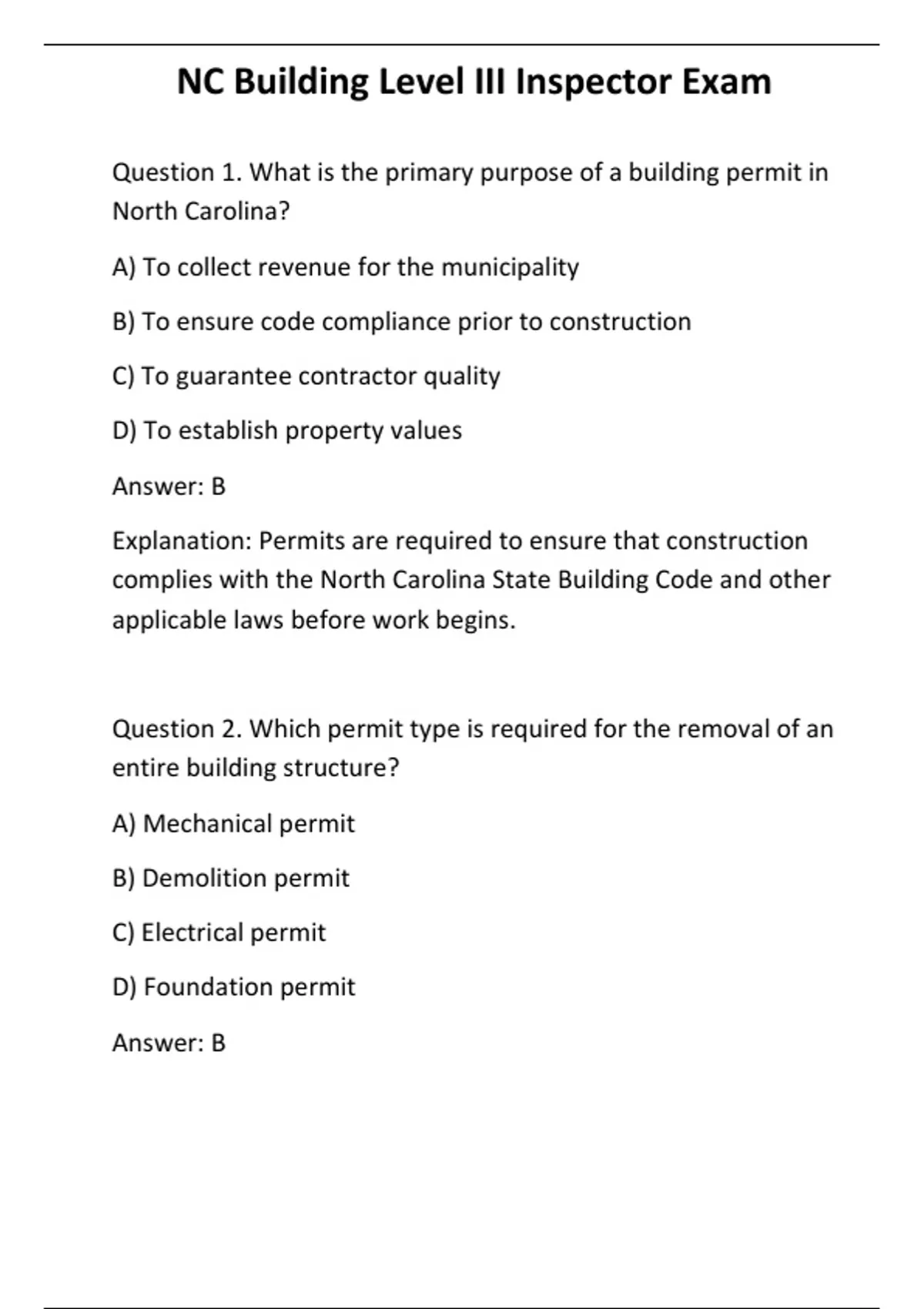NC Building Level III Inspector Exam