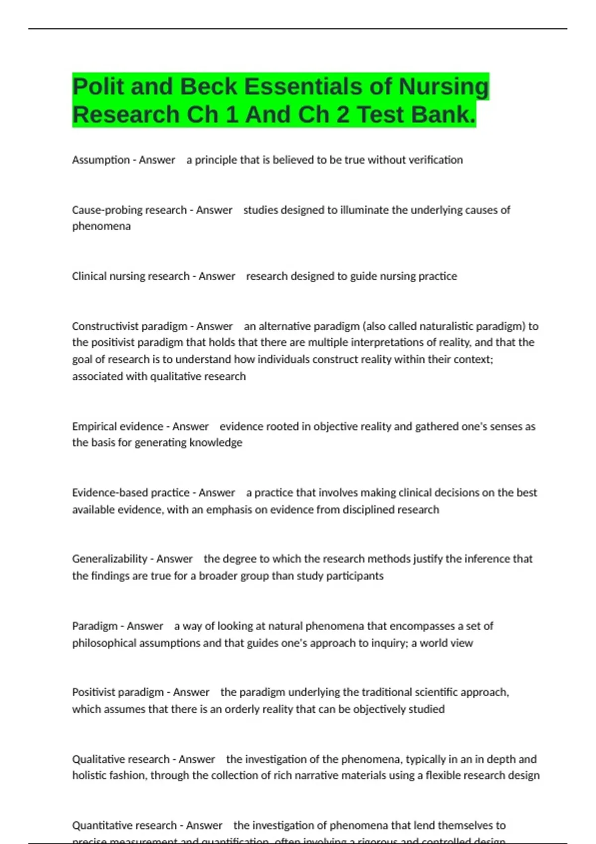 Polit and Beck Essentials of Nursing Research Ch 1 And Ch 2 Test Bank.