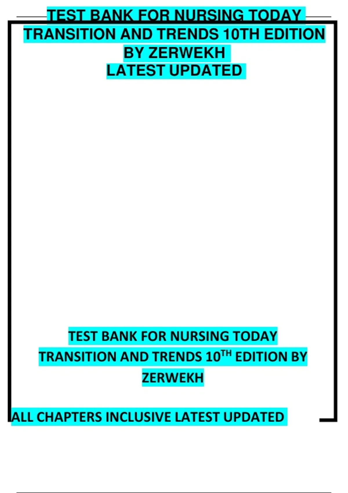 This document contains the updated test bank for Nursing Today: Transition and Trends, 10th Edition by Zerwekh. It provides a wide range of multiple-choice questions, case-based items, and application-style practice questions with answers and explanations. Content covers professional nursing roles, career transitions, leadership and management, health policy, legal and ethical issues, workplace trends, and current challenges in nursing practice. It is a comprehensive resource to support nursing students and professionals in exam preparation and career development.