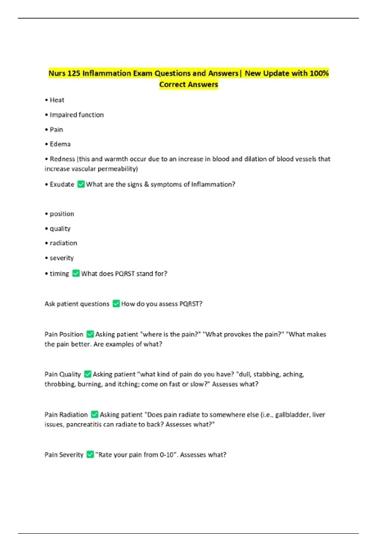 Nurs 125 Inflammation Exam Questions and Answers| New Update with 100% Correct Answers