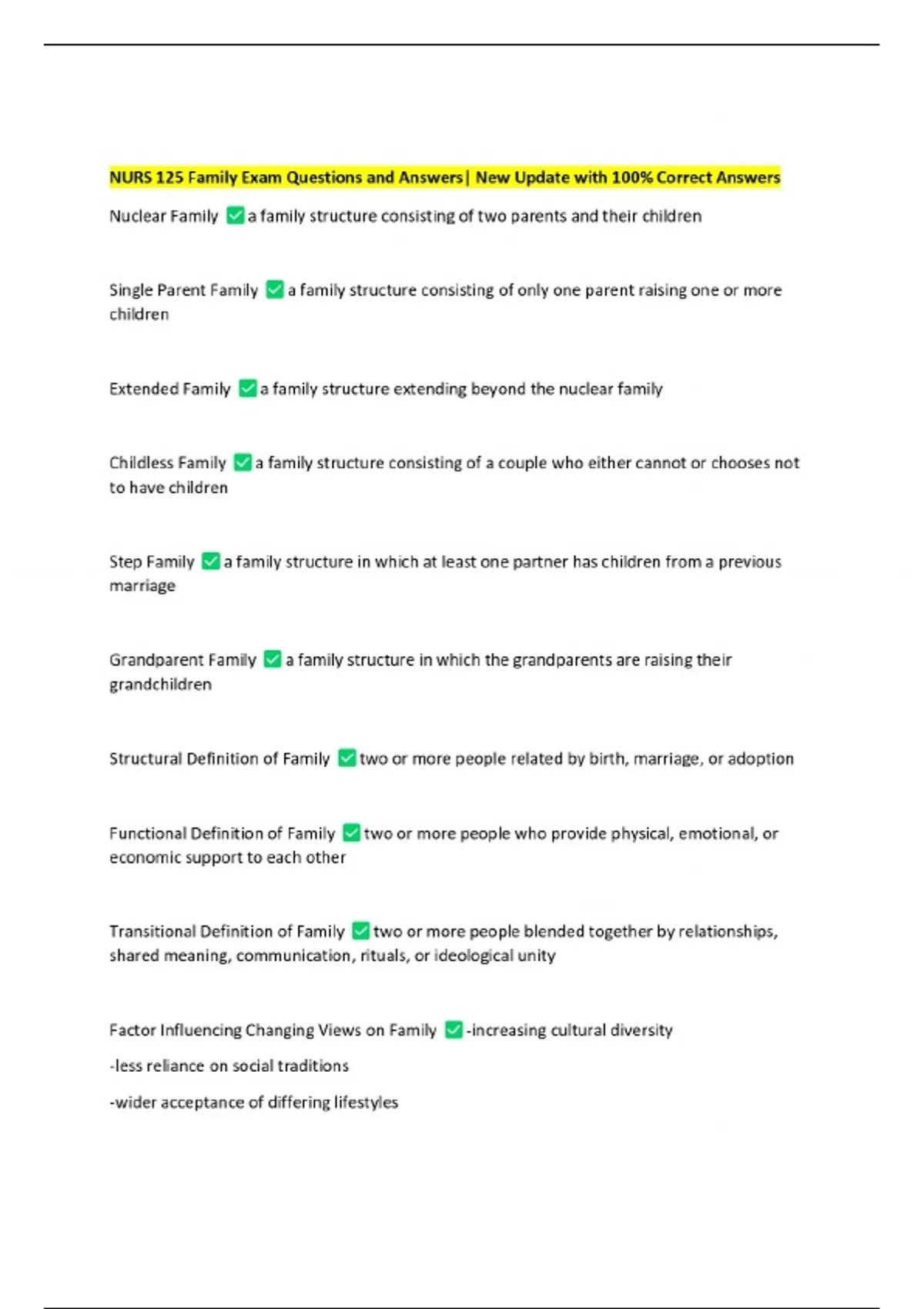 NURS 125 Family Exam Questions and Answers| New Update with 100% Correct Answers
