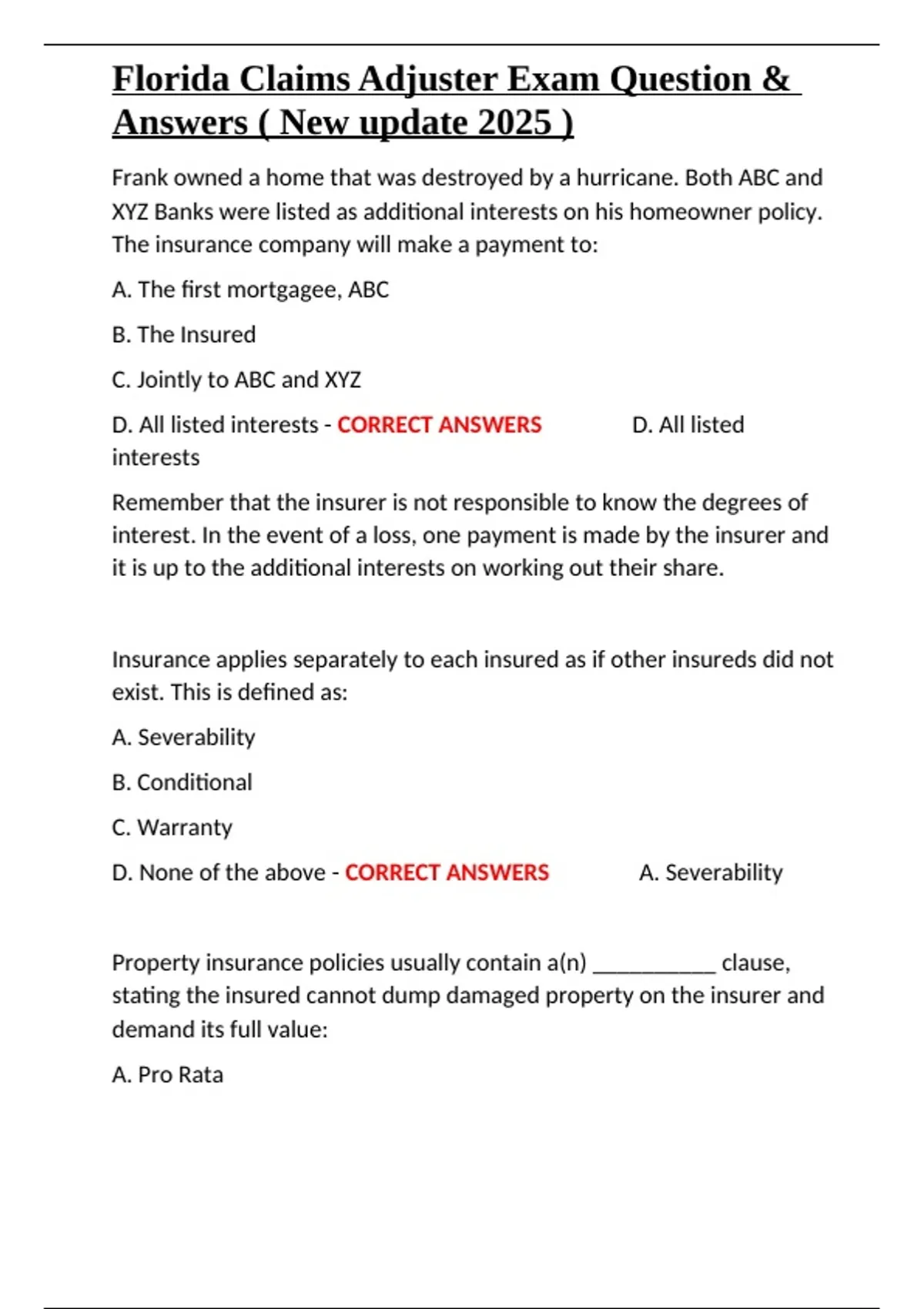 ,Florida Claims Adjuster Exam Question &