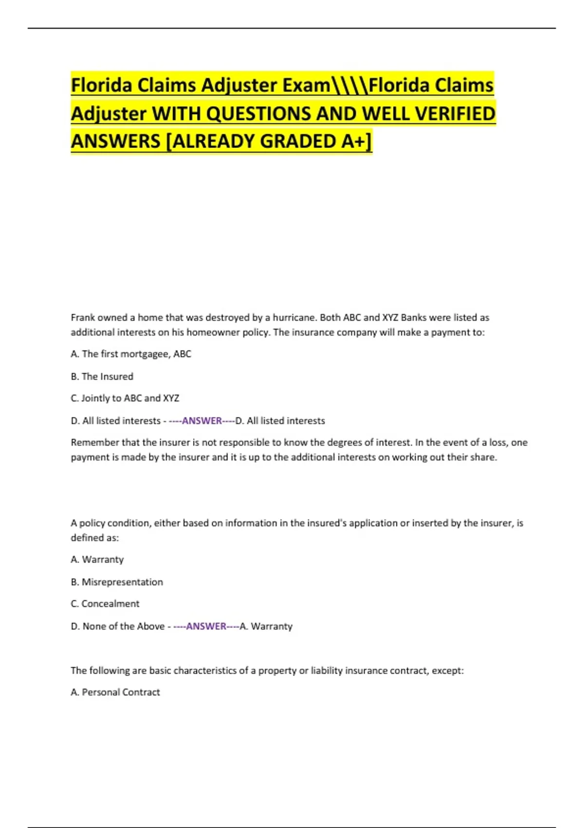 Florida Claims Adjuster Exam – Verified Questions with A+ Answers | Real Exam Prep