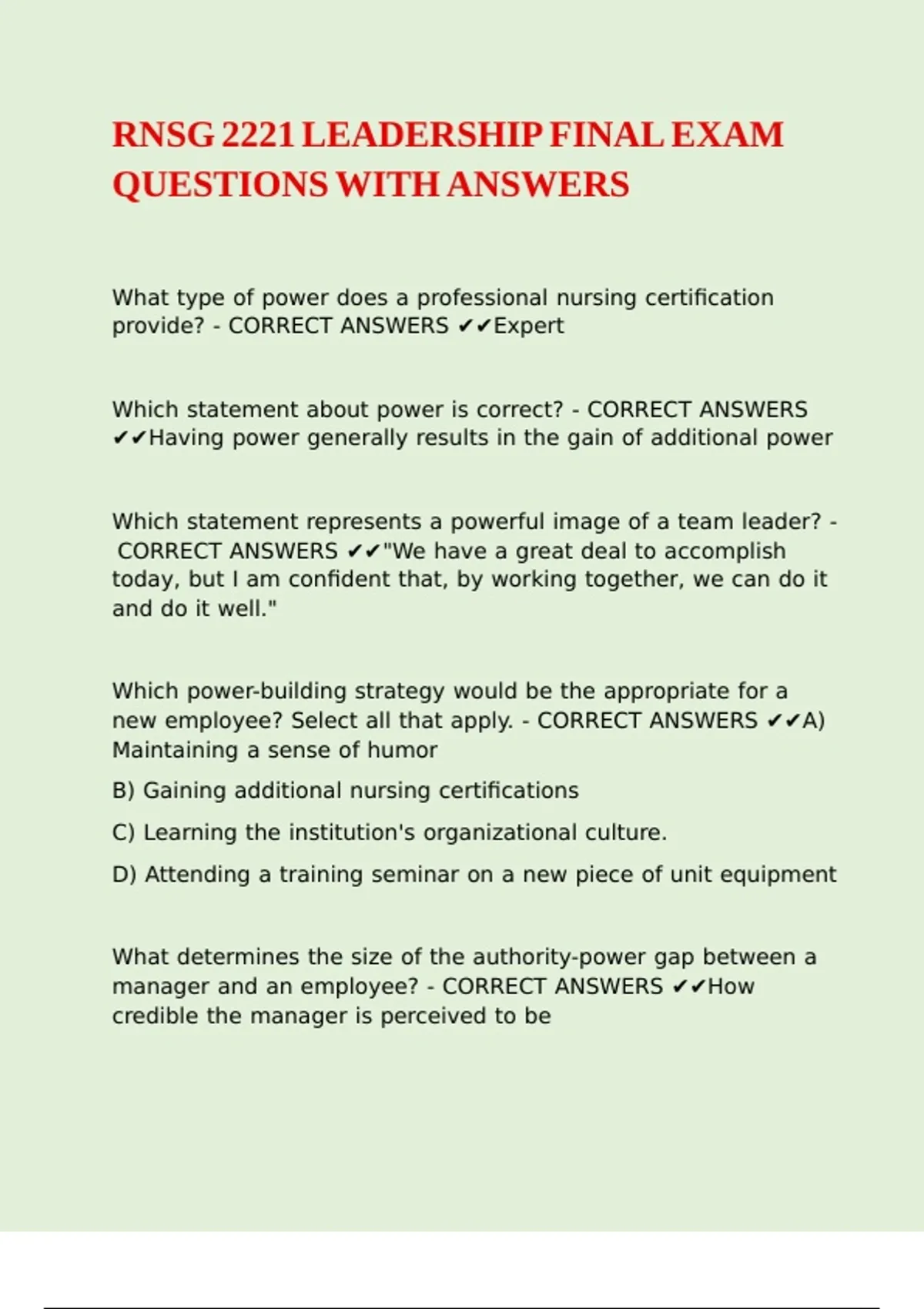 RNSG 2221 LEADERSHIP FINAL EXAM QUESTIONS WITH ANSWERS