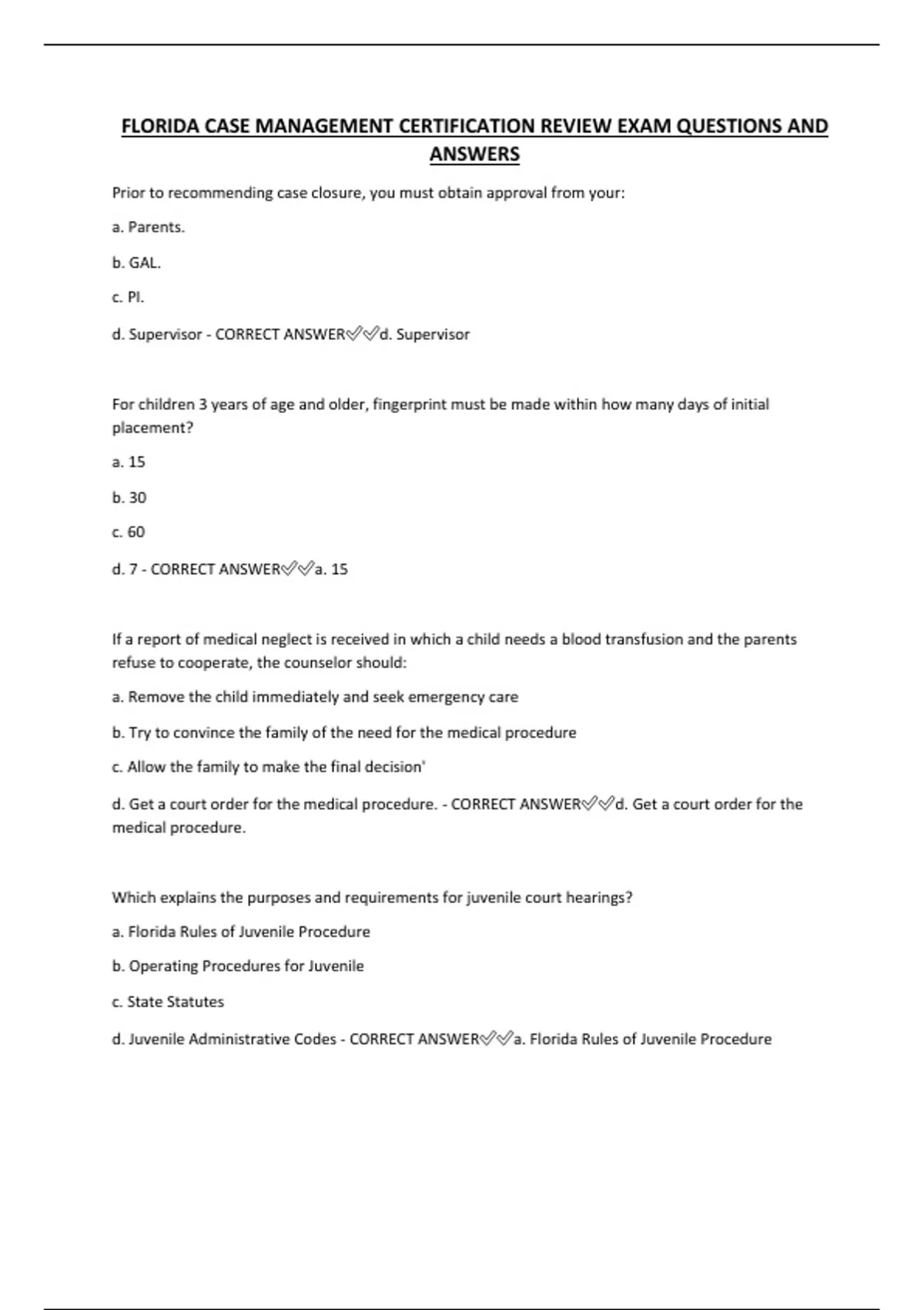 FLORIDA CASE MANAGEMENT CERTIFICATION REVIEW EXAM QUESTIONS AND ANSWERS Prior to recommending case closure, you must obtain approval from your: a. Parents. b. GAL. c. PI. d. Supervisor - CORRECT ANSWERd. Supervisor