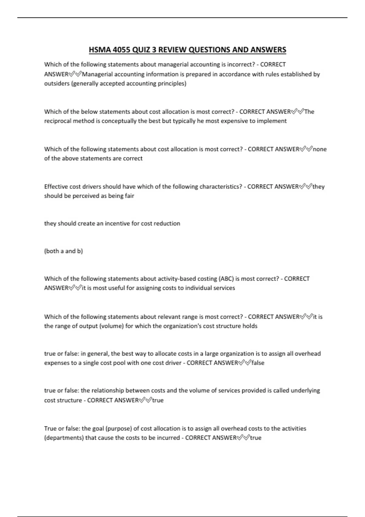 HSMA 4055 QUIZ 3 REVIEW QUESTIONS AND ANSWERS Which of the following statements about managerial accounting is incorrect? - CORRECT ANSWERManagerial accounting information is prepared in accordance with rules established by outsiders (generally accepted accounting principles)