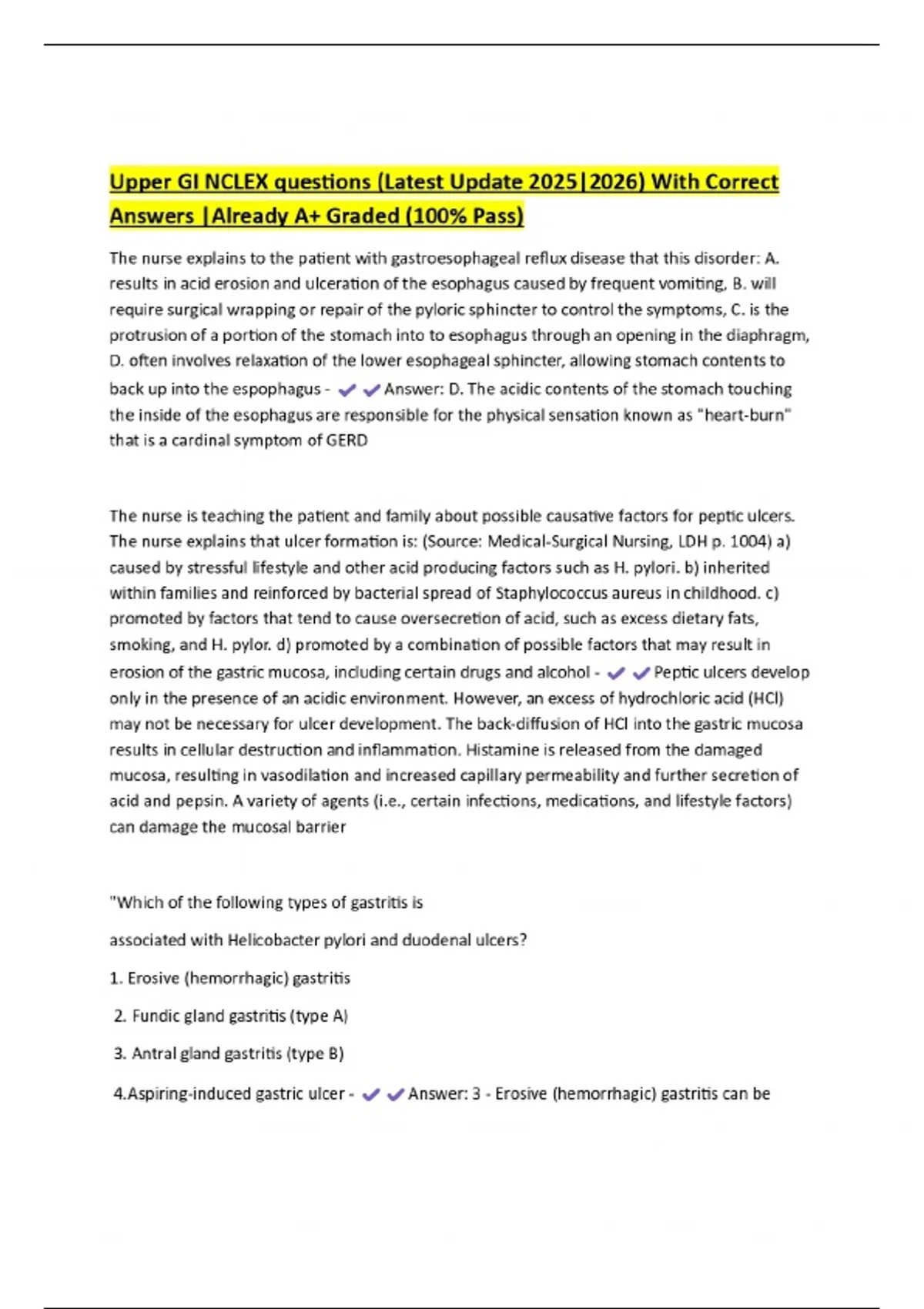 Upper GI NCLEX questions (Latest Update 2025|2026) With Correct Answers |Already A+ Graded (100% Pass)