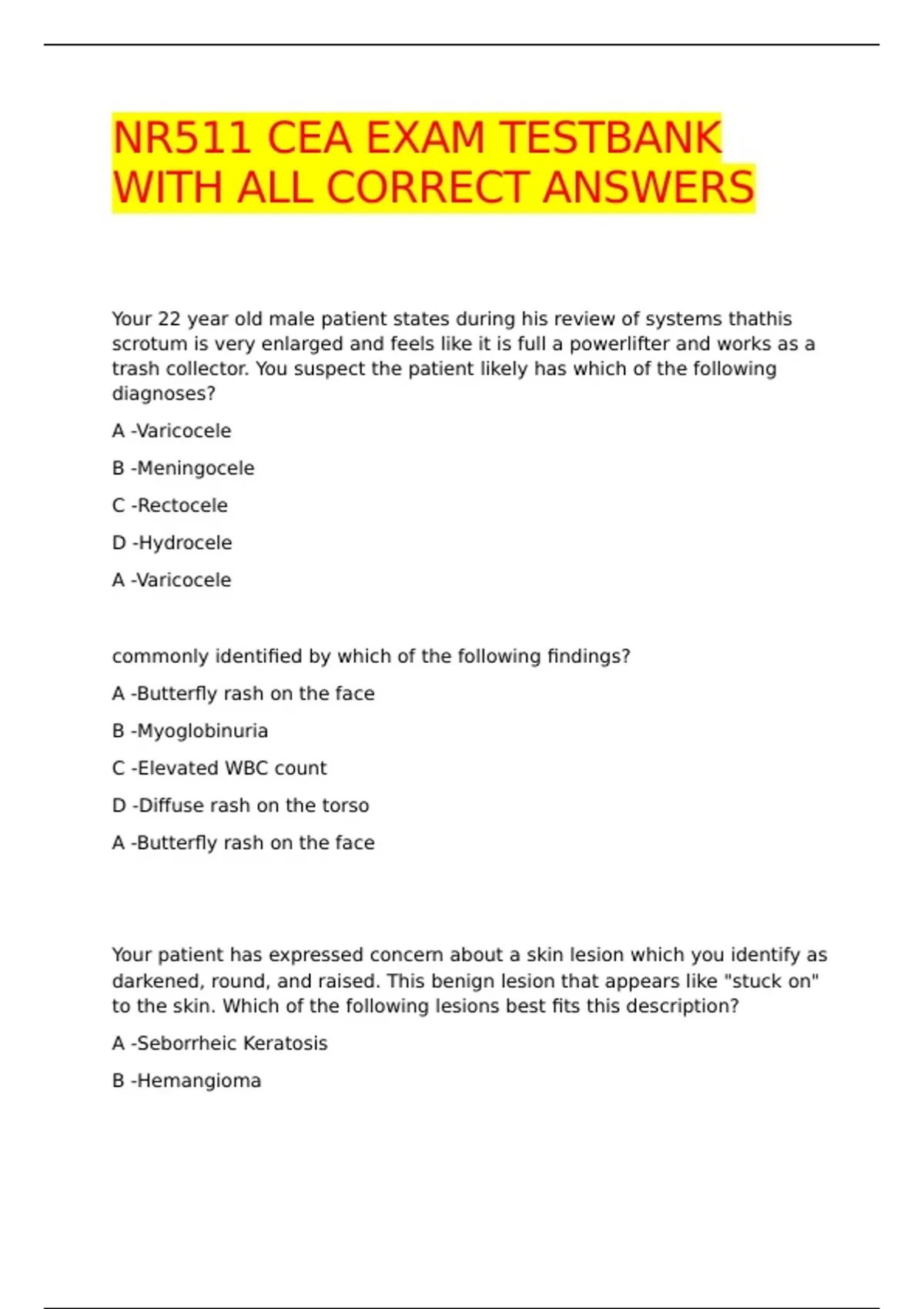 NR 511 CEA EXAM TESTBANK WITH 100- CORRECT ANSWERS
