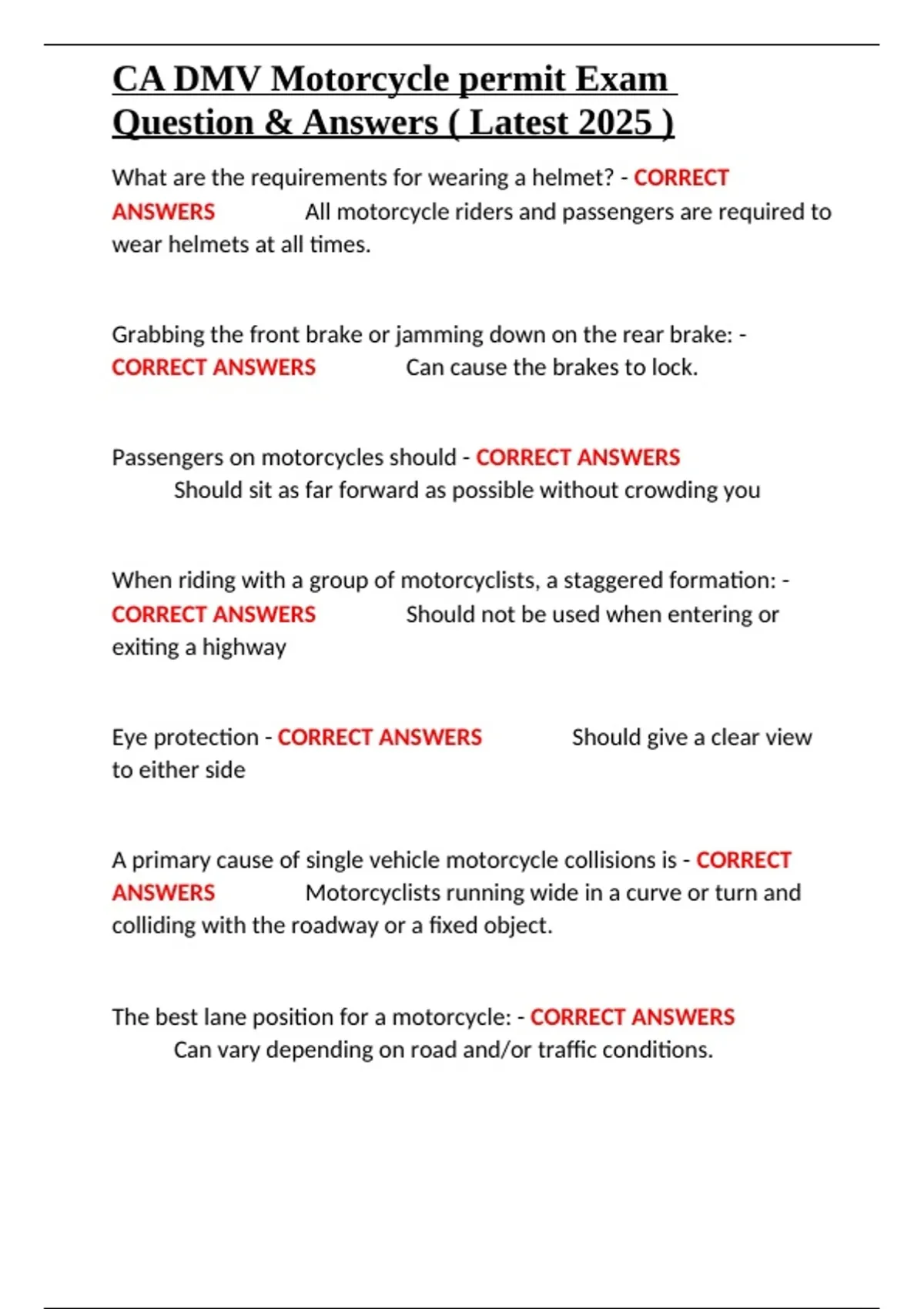 CA DMV Motorcycle permit Exam Question & Answers ( Latest 2025 ).docx