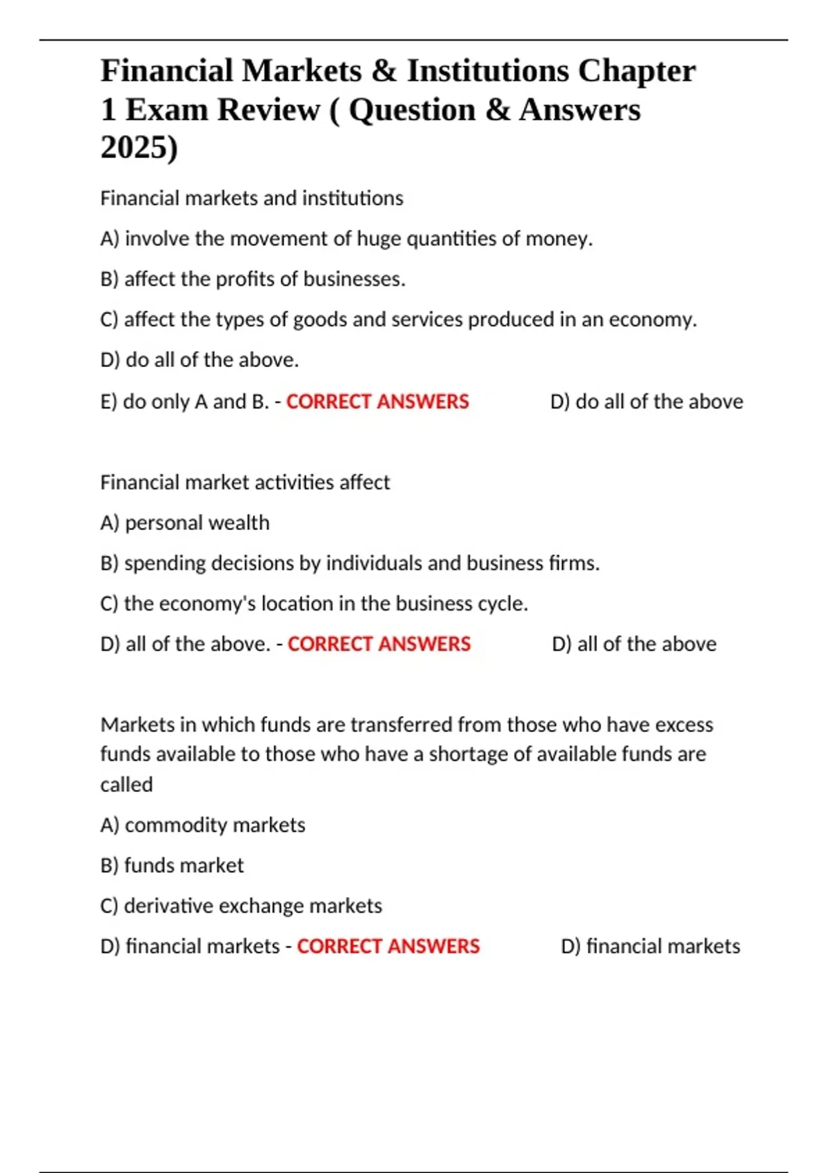 D) financial markets - CORRECT ANSWERS ✔✔D) financial markets