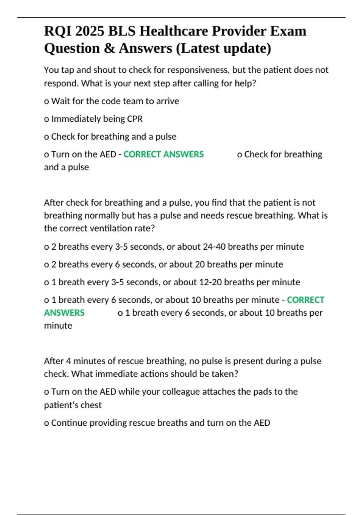 RQI 2025 BLS Healthcare Provider Exam Question & Answers (Latest update).docx