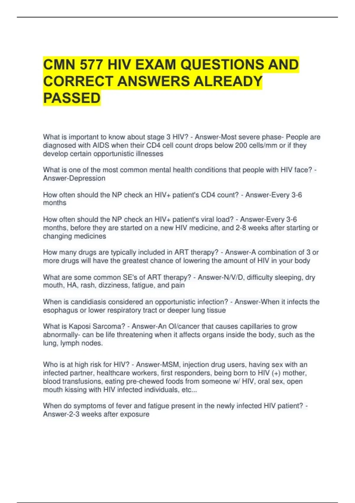 CMN 577 HIV EXAM QUESTIONS AND CORRECT ANSWERS ALREADY PASSED