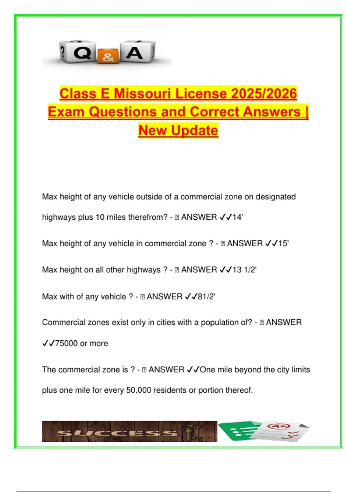 This document presents an updated collection of 75 accurate and exam-relevant questions and answers designed for the 2025/2026 Missouri Class E Driver’s License exam, covering both standard and commercial vehicle regulations. It aligns with the latest Missouri Department of Revenue (DOR) and Federal Motor Carrier Safety Regulations (FMCSR) guidelines, offering a robust foundation for success on the exam. Content highlights include: Vehicle dimension regulations: Maximum legal height, width, and length limits across different types of roads (interstates, commercial zones, city routes). Weight laws: Axle-specific and gross weight maximums, bridge-specific limits, and load extension allowances for different trailer types. Commercial zone boundaries for major Missouri cities like St. Louis, Kansas City, Springfield, Columbia, and St. Joseph. Load security, clearance safety, emergency equipment requirements, and hazardous material transport rules. Exemptions for certain vehicle types (farm-use, waste haulers, non-commercial local-use vehicles). Following distance standards, off-tracking compensation, railroad crossing protocols, and tailgating safety measures. It also includes practical scenarios such as parking surface assessment, gap judgment for road crossing, and interpretation of safety signage, making it not only exam-oriented but also highly applicable to real-world commercial driving. This material is especially suitable for students and professionals in: Commercial Driver’s License (CDL) programs Driving Education and Training Transportation Law Public Safety and Enforcement Logistics and Fleet Operations Whether you're enrolled at the University of Missouri, a state-accredited driving school, or an independent learner, this guide ensures comprehensive, regulation-compliant preparation for the Missouri Class E exam. Keywords: Missouri Class E 2025, DOR license exam MO, FMCSR truck rules, weight limits Missouri, commercial zone distances, CDL prep Missouri, vehicle load laws, emergency equipment requirements, truck length legal limits, bridge weight restrictions, off-tracking turns, driving gap safety, railroad crossing rules, commercial driver Missouri, University of Missouri transport law