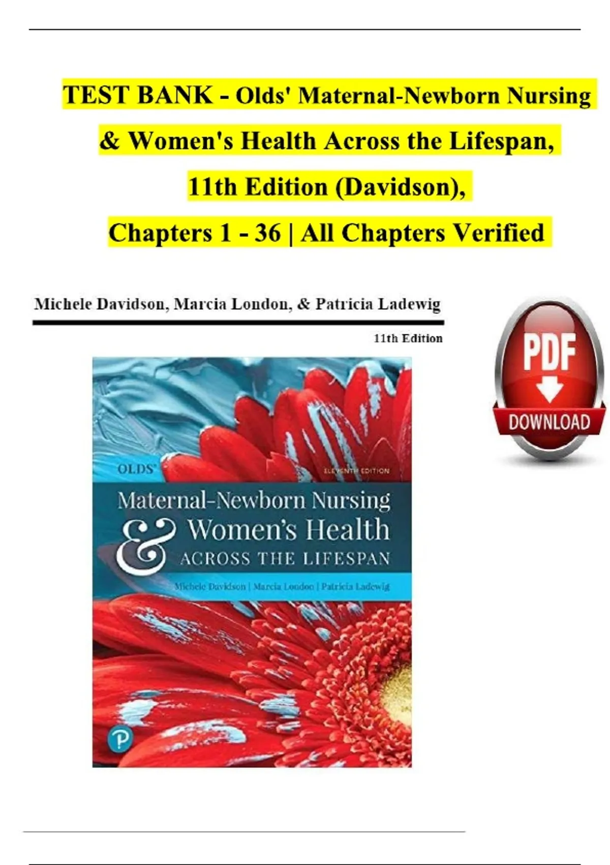 Test Bank - Olds’ Maternal-Newborn Nursing & Women’s Health Across the Lifespan, 11th Edition, Michele Davidson, Marcia London, Patricia Ladewig . Full Chapters Include;...PART I: INTRODUCTION TO MATERNAL-NEWBORN NURSING 1. Contemporary Maternal-Newborn Nursing 2. Families, Cultures, and Complementary Therapies PART II: WOMEN'S HEALTH ACROSS THE LIFESPAN 3. Health Promotion 4. Family Planning 5. Commonly Occurring Infections 6. Women's Health Problems 7. Social Issues 8. Violence Against Women PART III: HUMAN REPRODUCTION 9. Reproductive Physiology, Conception, and Fetal Development 10. Reproductive Genetics PART IV: PREGNANCY 11. Physical and Psychologic Changes of Pregnancy 12. Antepartum Nursing Assessment 13. The Expectant Family: Needs and Care 14. Maternal Nutrition 15. Pregnancy in Selected Populations 16. Assessment of Fetal Well-Being 17. Pregnancy at Risk: Pregestational Problems 18. Pregnancy at Risk: Gestational Onset PART V: LABOR AND BIRTH 19. Processes and Stages of Labor and Birth 20. Intrapartum Nursing Assessment 21. The Family in Childbirth: Needs and Care 22. Pharmacologic Pain Management 23. Childbirth at Risk: Prelabor Onset Complications 24. Childbirth at Risk: Labor-Related Complications 25. Birth-Related Procedures PART VI: THE NEWBORN 26. Physiologic Responses of the Newborn to Birth 27. Nursing Assessment of the Newborn 28. The Normal Newborn: Needs and Care 29. Newborn Nutrition 30. The Newborn at Risk: Conditions Present at Birth 31. The Newborn at Risk: Birth-Related Stressors PART VII: POSTPARTUM 32. Postpartum Adaptation and Nursing Assessment 33. The Postpartum Family: Needs and Care 34. Home Care of the Postpartum Family 35. The Postpartum Family at Risk 36. Grief and Loss in the Childbearing Family
