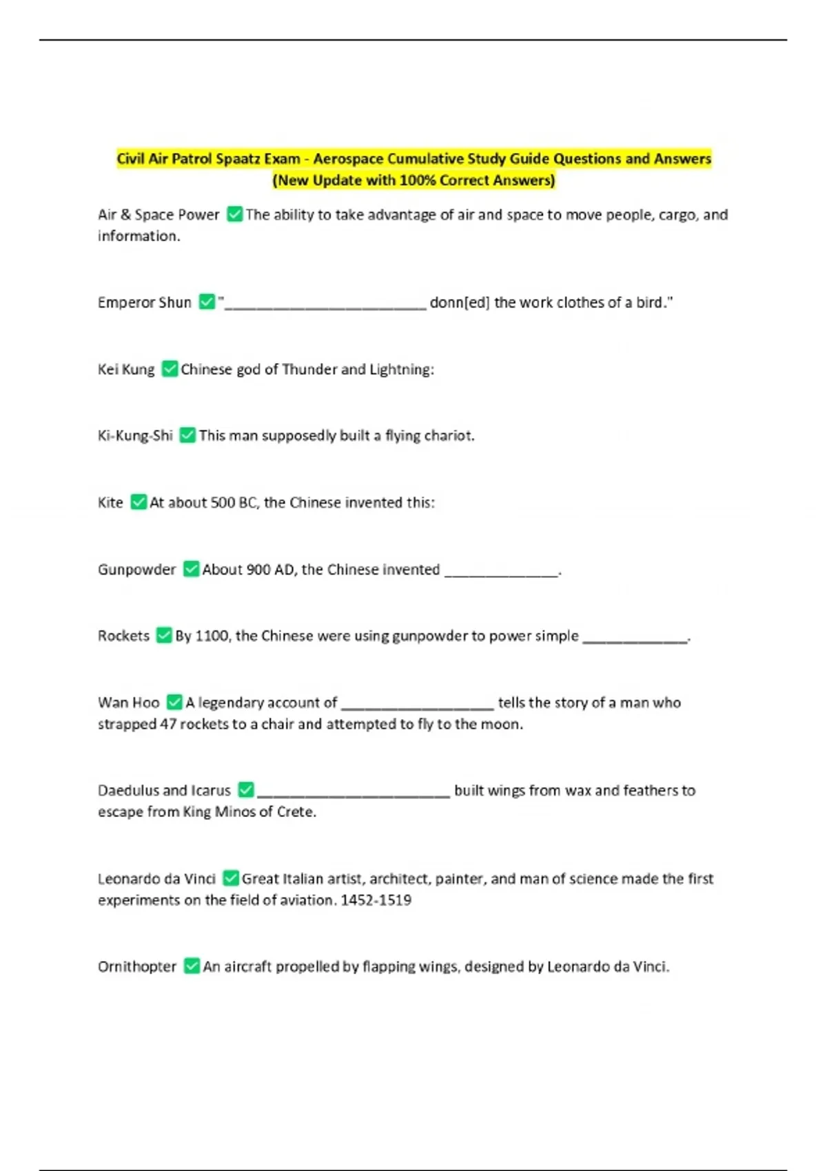 Civil Air Patrol Spaatz Exam - Aerospace Cumulative Study Guide Questions and Answers (New Update with 100% Correct Answers)