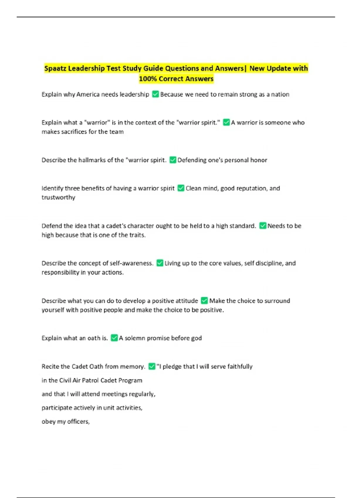Spaatz Leadership Test Study Guide Questions and Answers| New Update with 100% Correct Answers