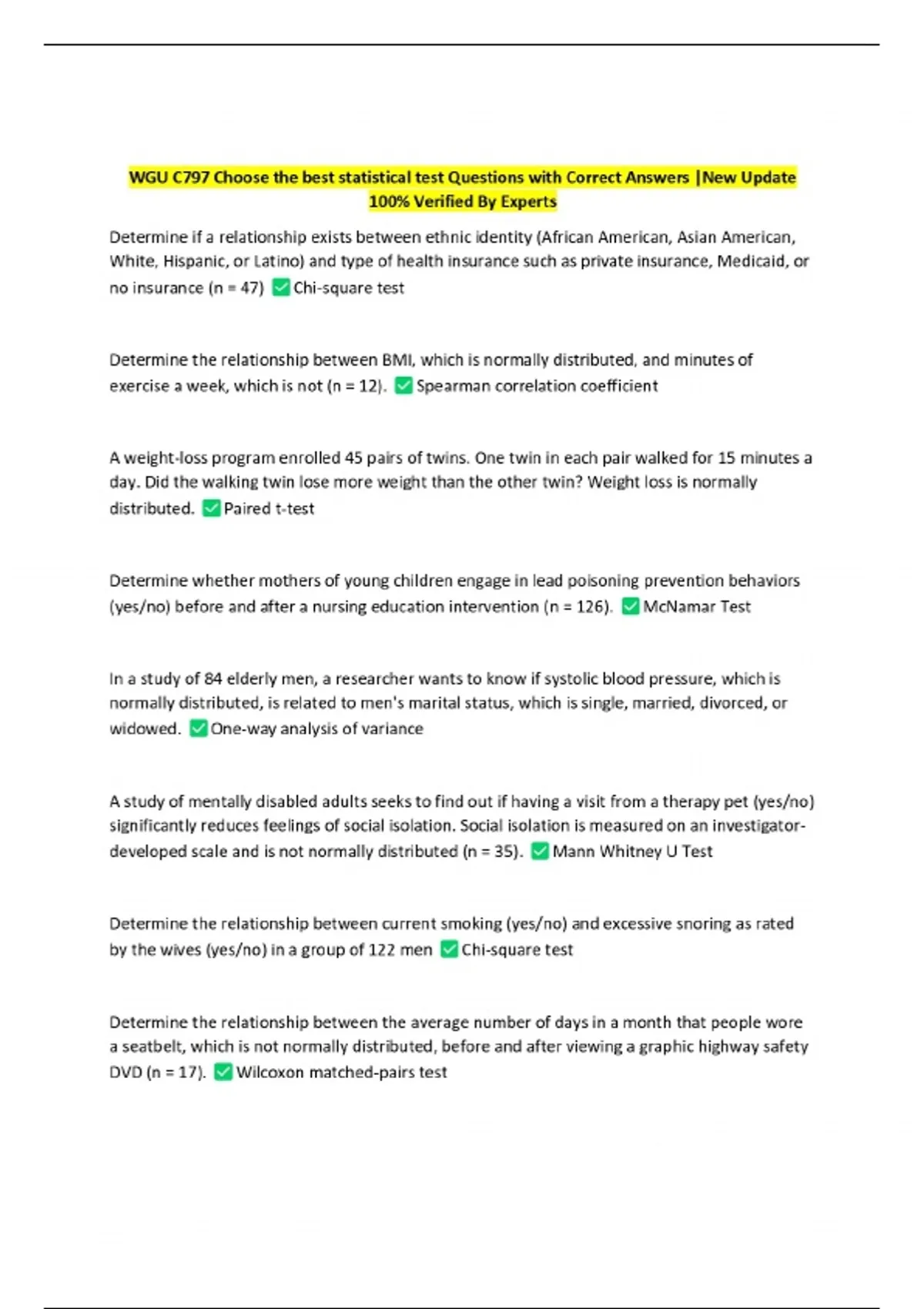 WGU C797 Choose the best statistical test Questions with Correct Answers |New Update 100% Verified By Experts