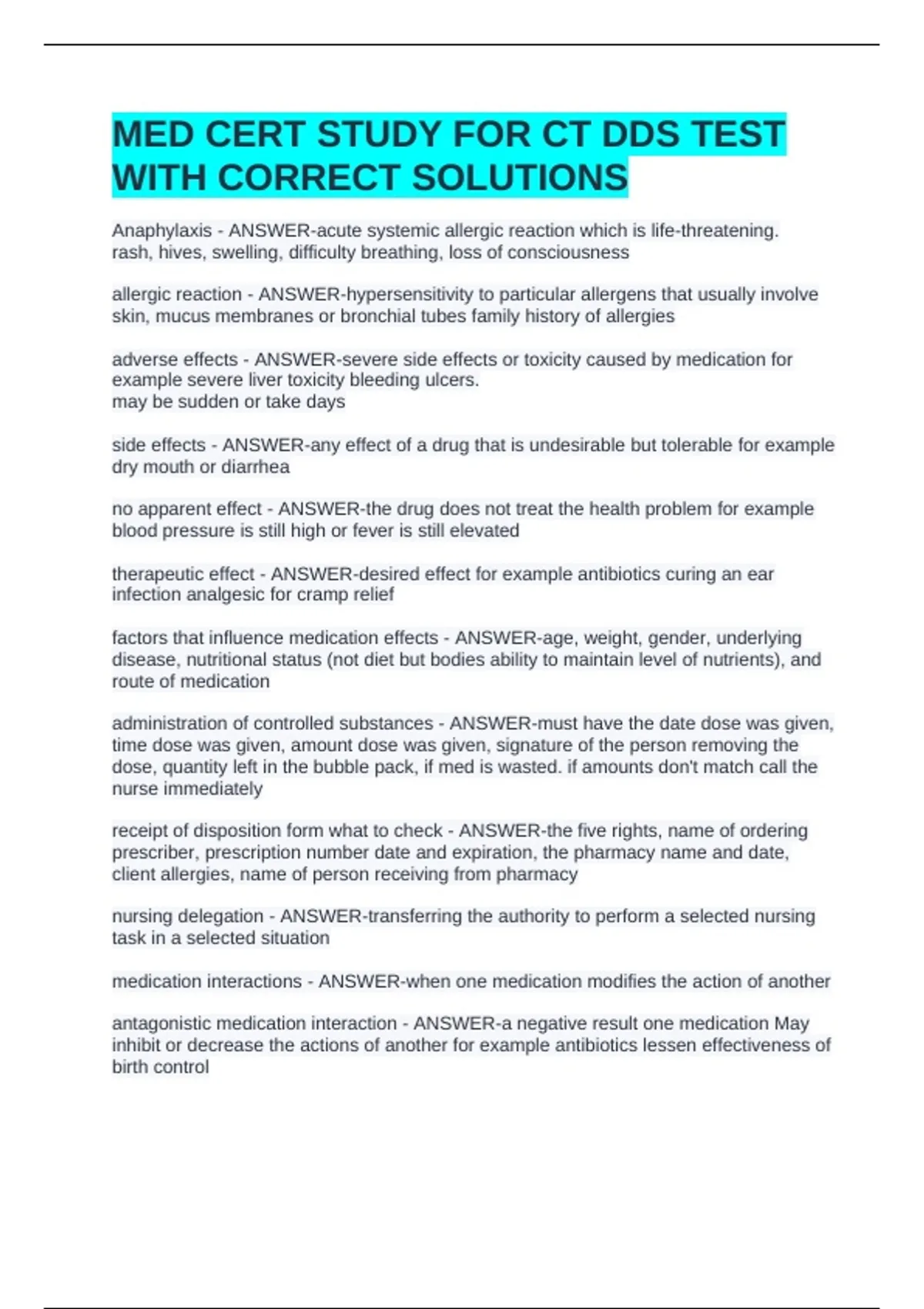 MED CERT STUDY FOR CT DDS TEST WITH CORRECT SOLUTIONS
