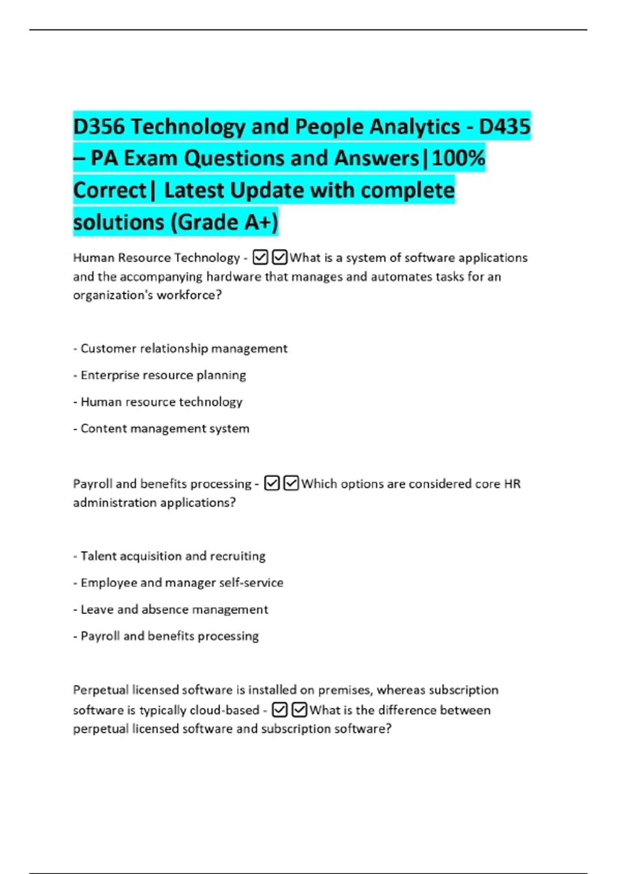 D356 Technology and People Analytics - D435 – PA Exam Questions and Answers|100% Correct| Latest Update with complete solutions (Grade A+) Human Resource Technology - What is a system of software applications and the accompanying hardware that manages and automates tasks for an organization's workforce? - Customer relationship management - Enterprise resource planning - Human resource technology - Content management syste