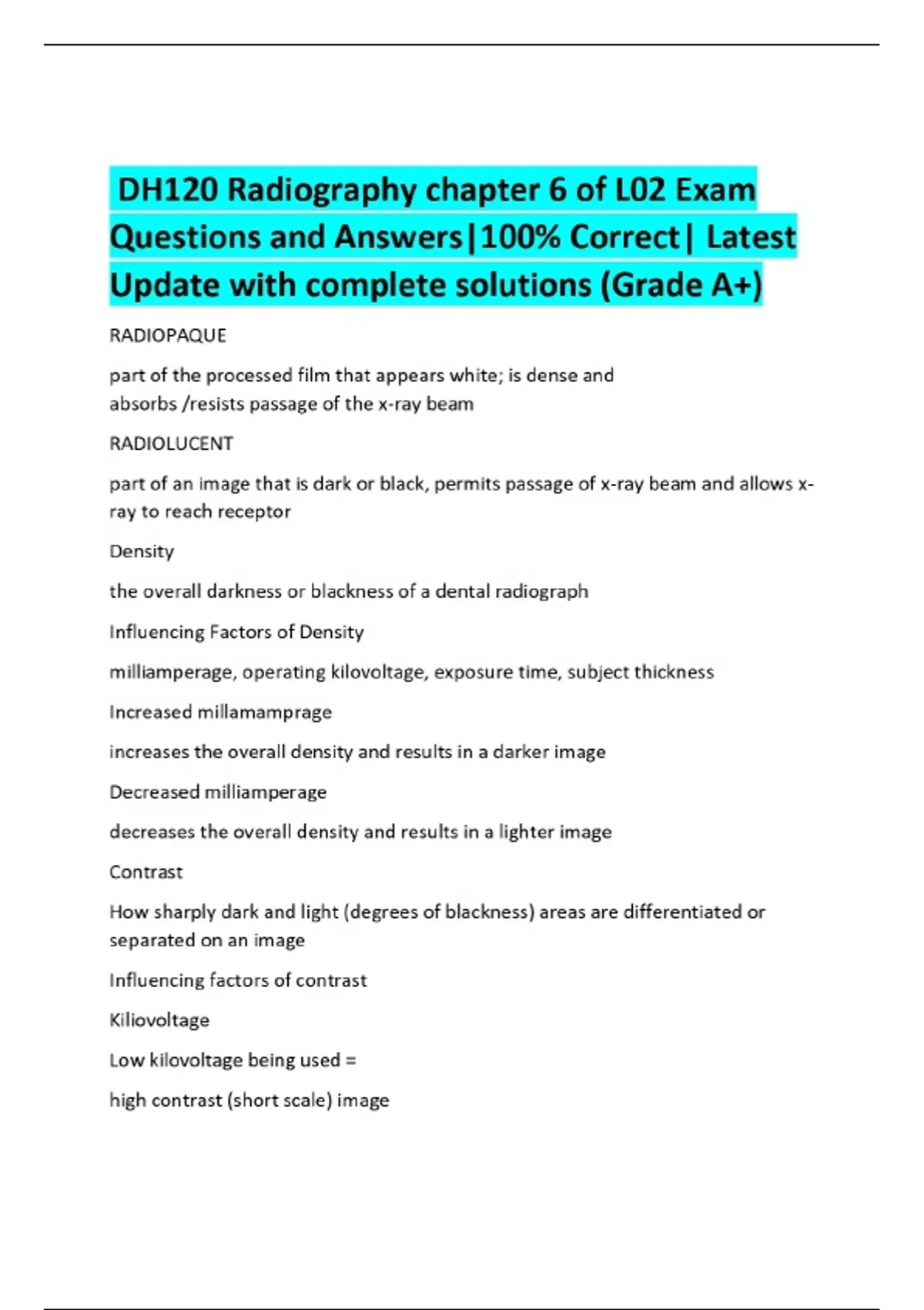 DH120 Radiography chapter 6 of L02 Exam Questions and Answers|100% Correct| Latest Update with complete solutions (Grade A+)
