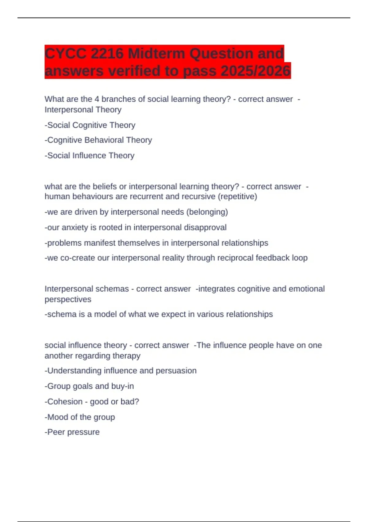 CYCC 2216 Midterm Question and answers verified to pass 2025/2026 What are the 4 branches of social learning theory? - correct answer -Interpersonal Theory -Social Cognitive Theory -Cognitive Behavioral Theory -Social Influence Theory what are the beliefs or interpersonal learning theory? - correct answer -human behaviours are recurrent and recursive (repetitive) -we are driven by interpersonal needs (belonging) -our anxiety is rooted in interpersonal disapproval -problems manifest themselves in interpersonal relationships -we co-create our interpersonal reality through reciprocal feedback loop Interpersonal schemas - correct answer -integrates cognitive and emotional perspectives -schema is a model of what we expect in various relationships social influence theory - correct answer -The influence people have on one another regarding therapy -Understanding influence and persuasion -Group goals and buy-in -Cohesion - good or bad? -Mood of the group -Peer pressure -Groupthink