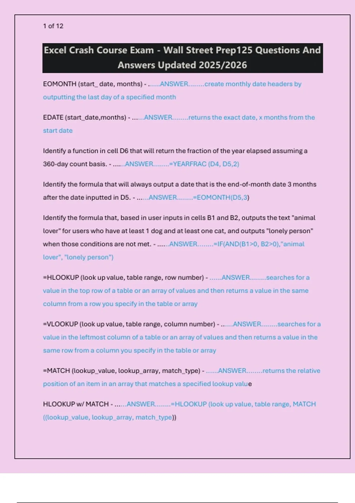 A comprehensive guide to the Excel Crash Course Exam by Wall Street Prep, featuring 125 questions and answers updated for 2025/2026. Learn essential Excel functions like EOMONTH, VLOOKUP, HLOOKUP, MATCH, OFFSET, INDEX, and more. Master keyboard shortcuts, financial formulas (NPV, IRR, XNPV), text functions, and data manipulation techniques. Perfect for finance professionals, students, and anyone preparing for Excel certification exams.