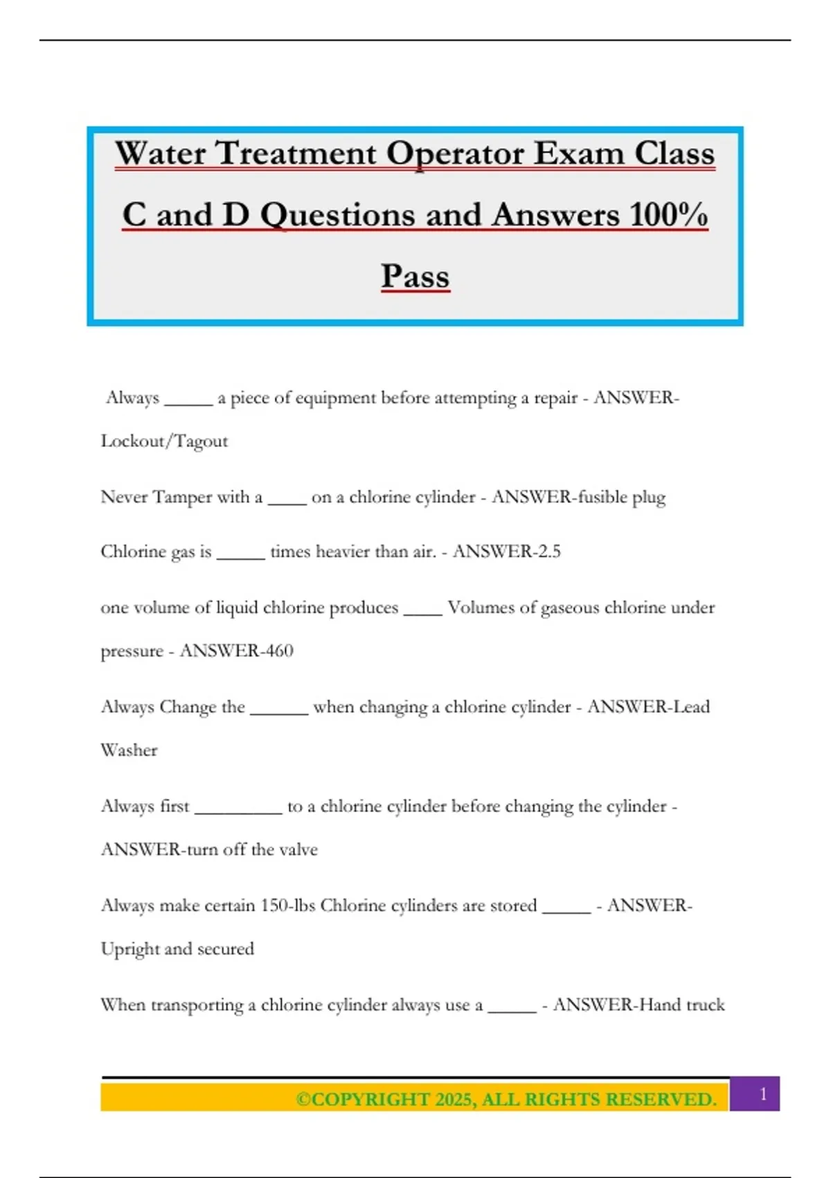 Water Treatment Operator Exam Class C and D Questions and Answers 100% Pass
