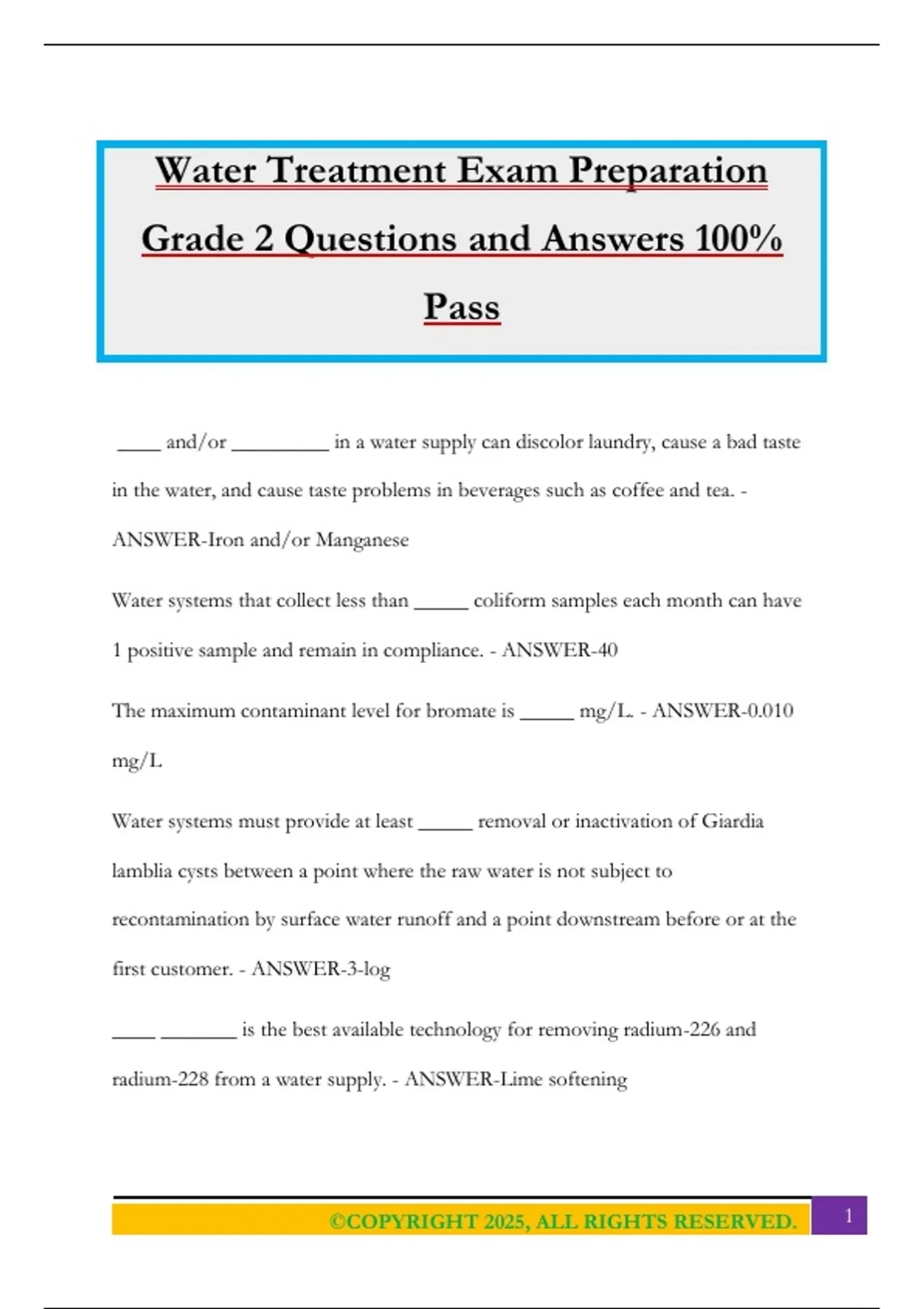 Water Treatment Exam Preparation Grade 2 Questions and Answers 100% Pass