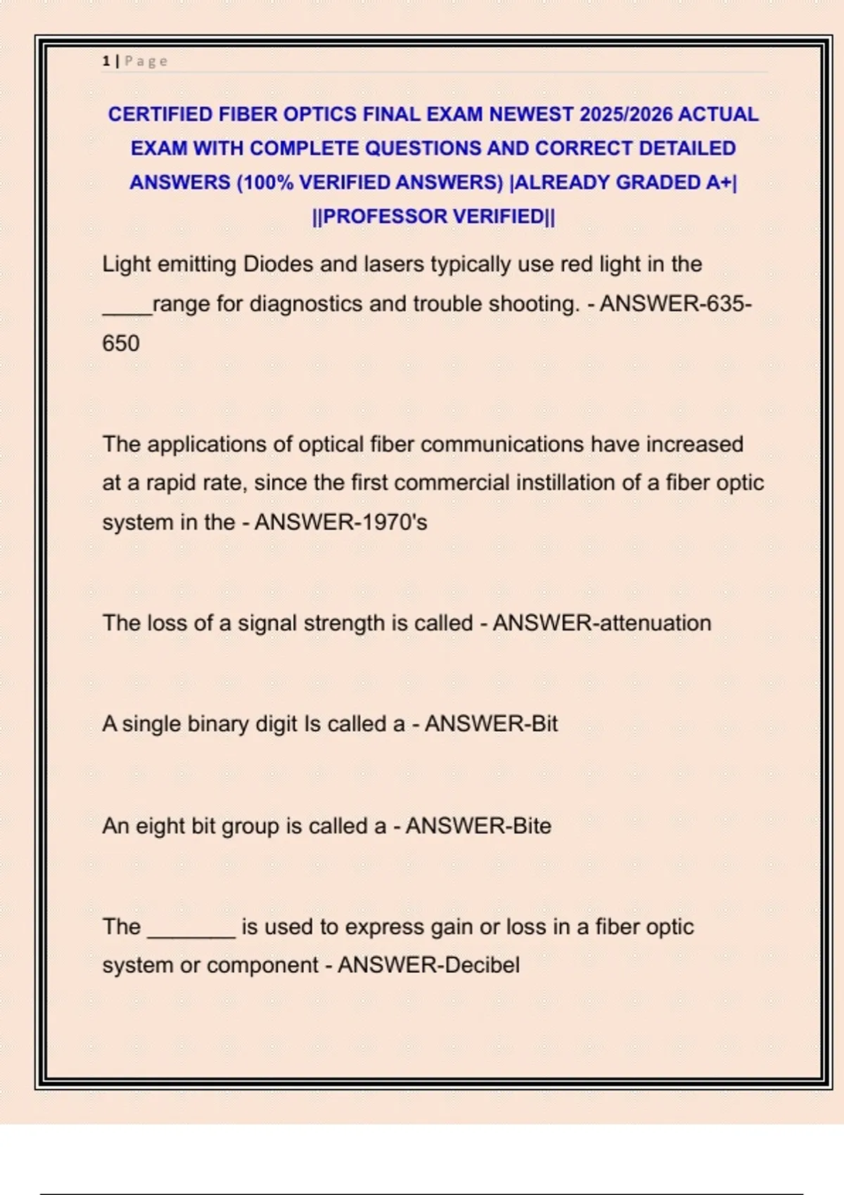 CERTIFIED FIBER OPTICS FINAL EXAM NEWEST 2025/2026 ACTUAL