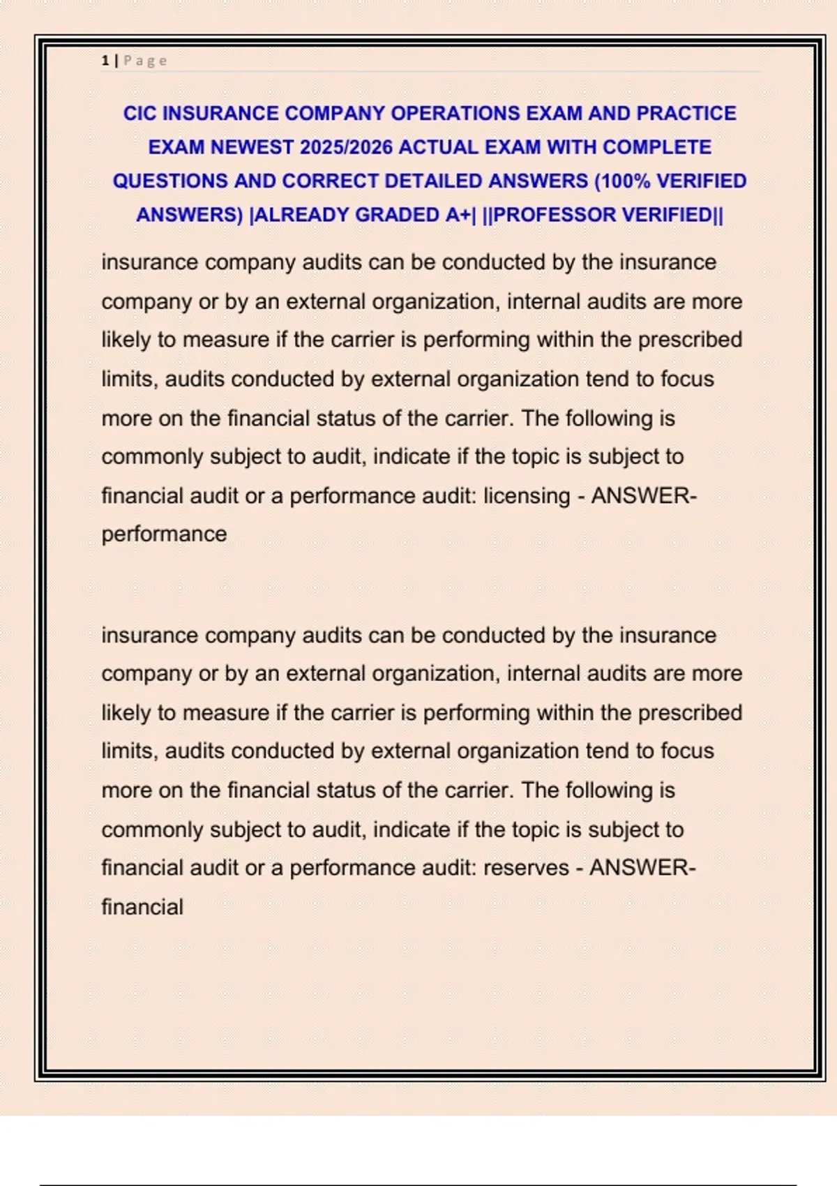 CIC INSURANCE COMPANY OPERATIONS EXAM AND PRACTICE EXAM NEWEST 2025/2026 ACTUAL EXAM WITH COMPLETE QUESTIONS AND CORRECT DETAILED ANSWERS (100% VERIFIED ANSWERS) |ALREADY GRADED A+| ||PROFESSOR VERIFIED||