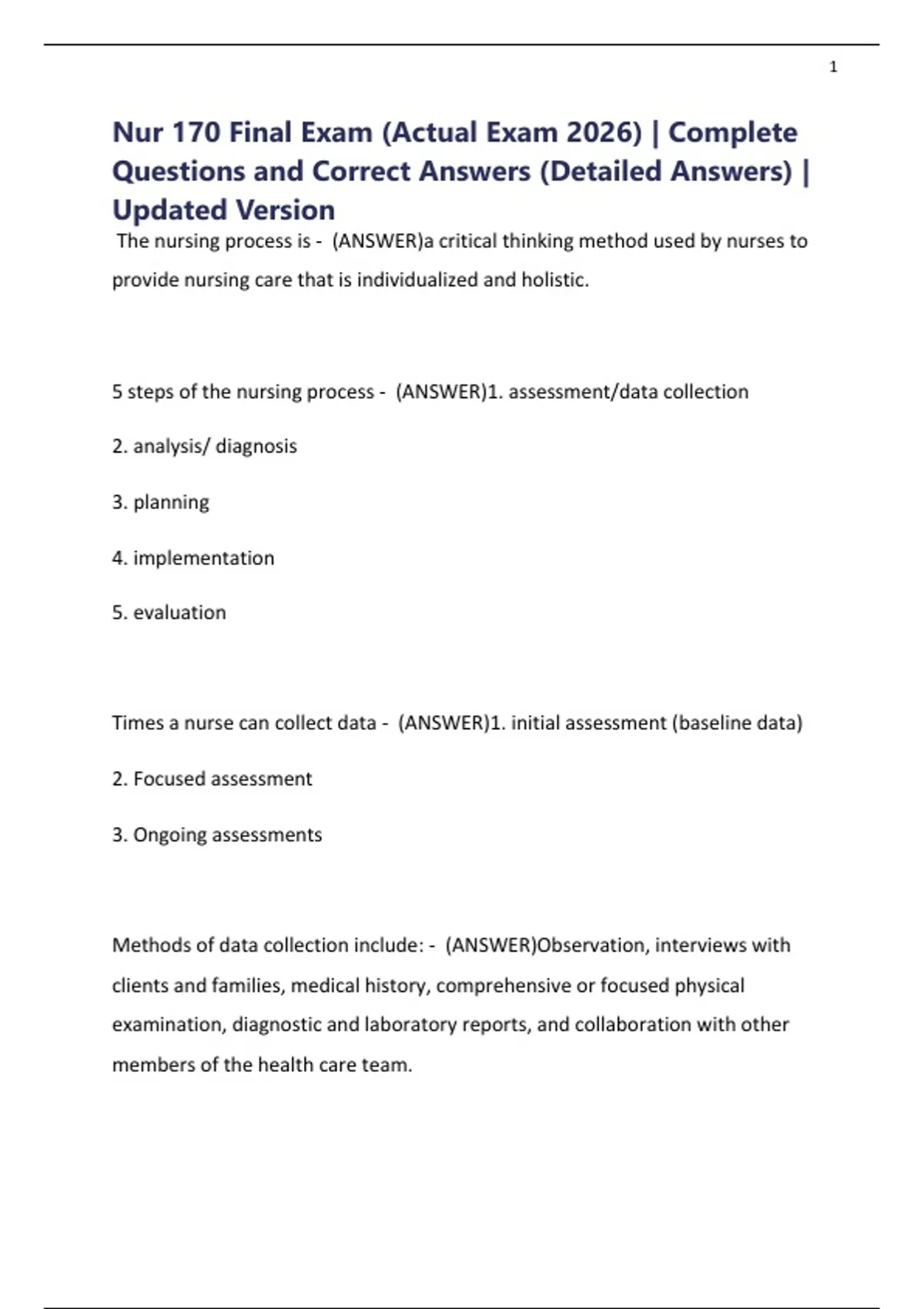 Nur 170 Final Exam (Actual Exam 2026) | Complete
