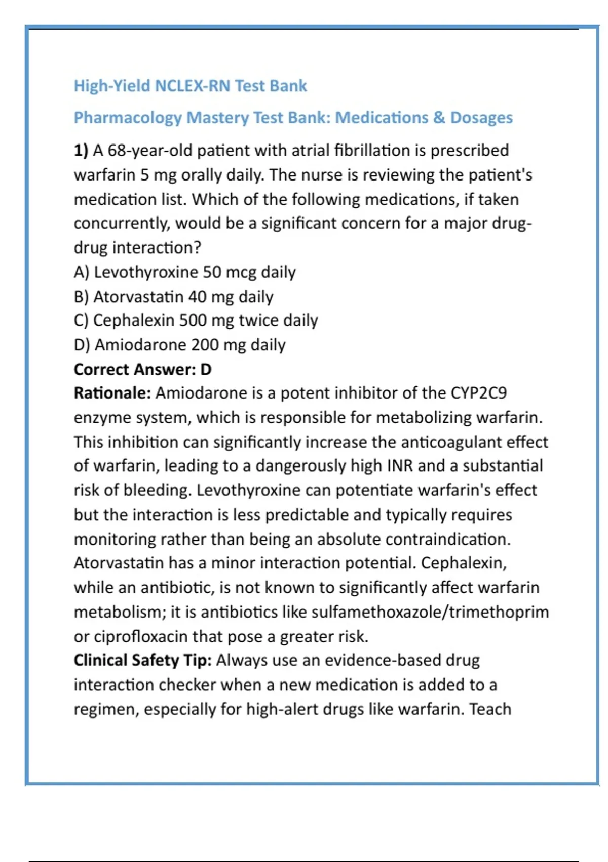 1) A 68-year-old patient with atrial fibrillation is prescribed