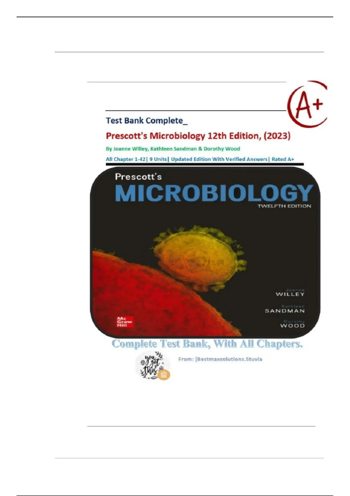 Test Bank for Prescott's Microbiology 12th Edition (McGraw Hill, 2022) by Joanne Willey, Kathleen Sandman and Dorothy Wood, Isbn no; 9781264777334, all 42 Chapters Covered
