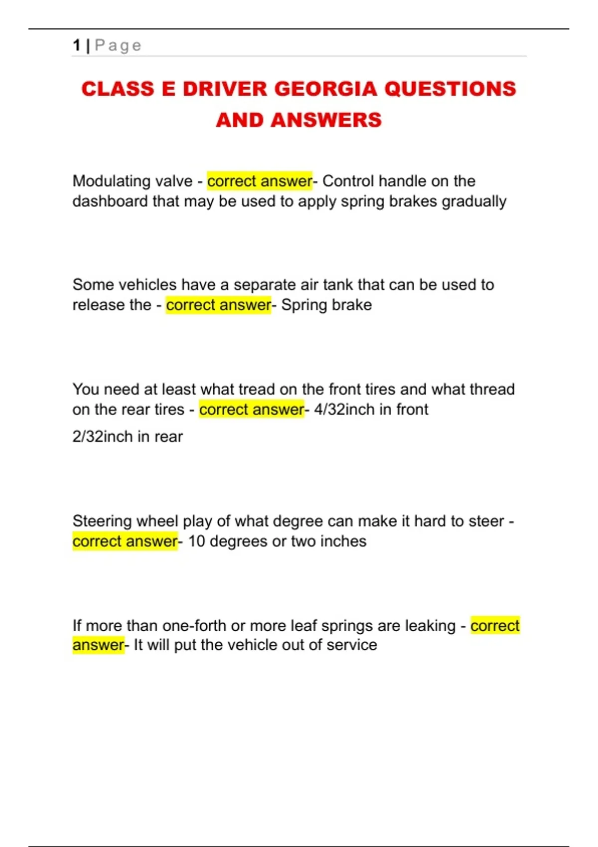 CLASS E DRIVER GEORGIA QUESTIONS