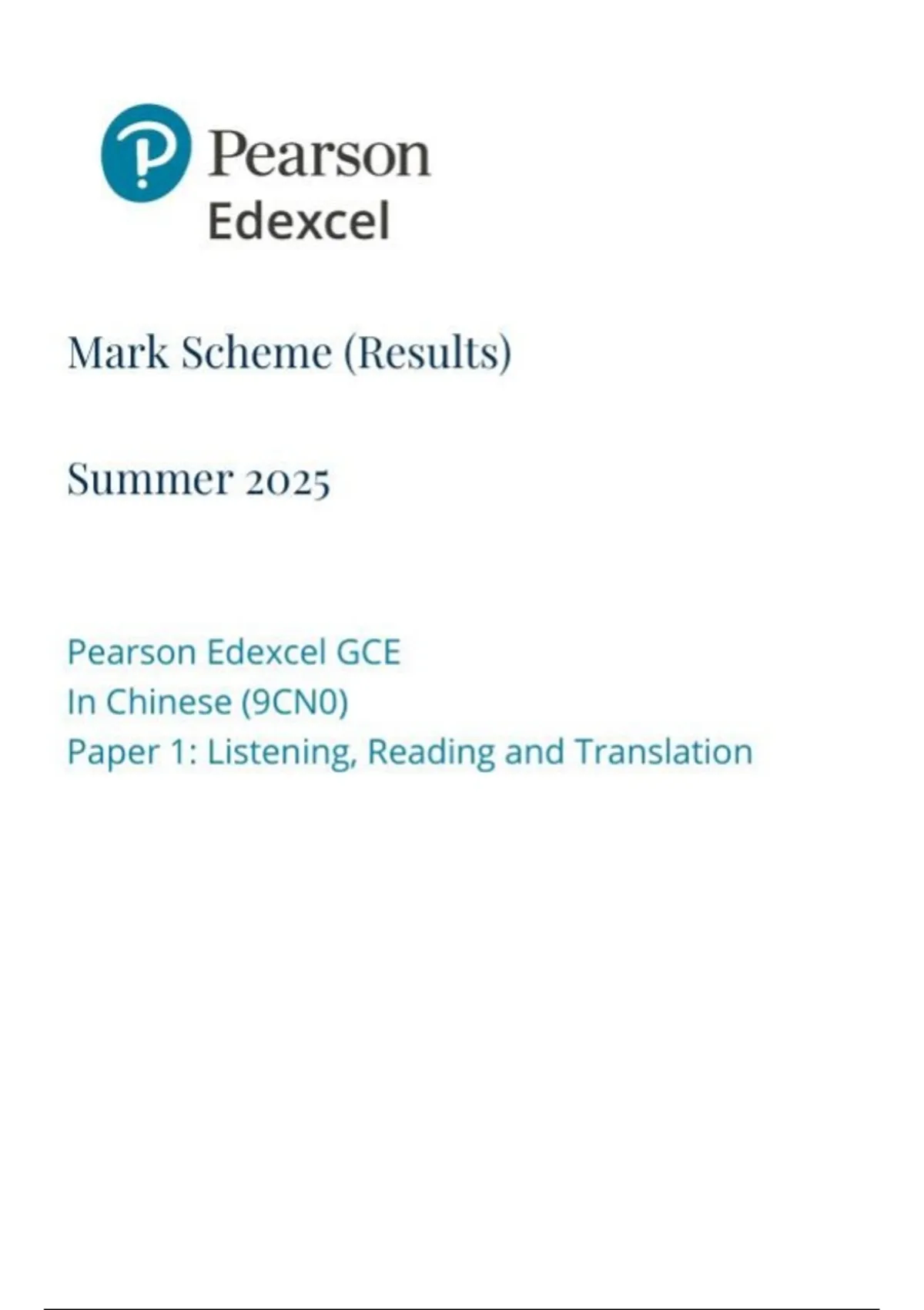 Pearson Edexcel GCE In Chinese (9CN0) Paper 1: Listening, Reading and Translation mark scheme june-2025.