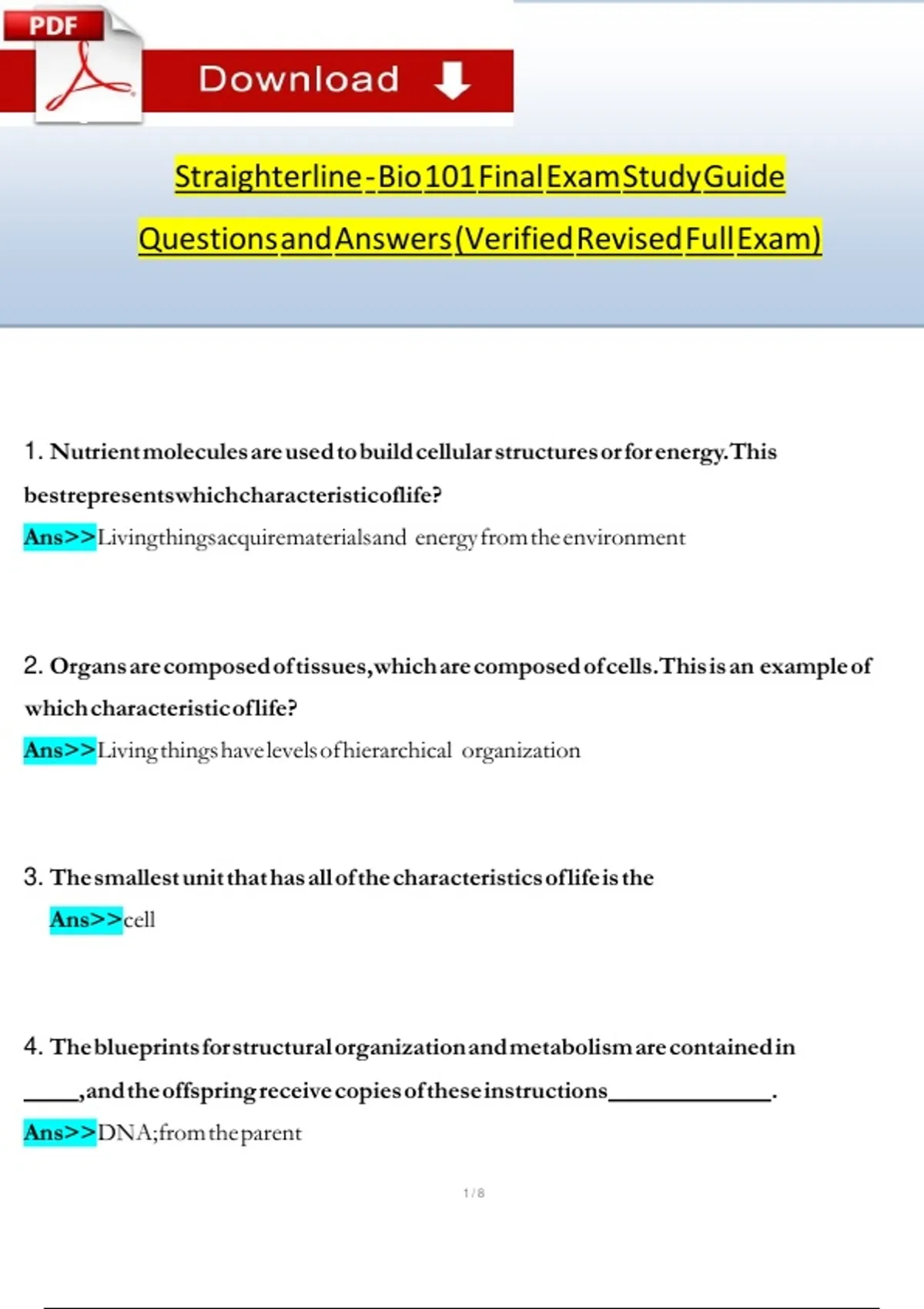 Straighterline - Bio 101 Final Exam Study Guide v v v v v v v