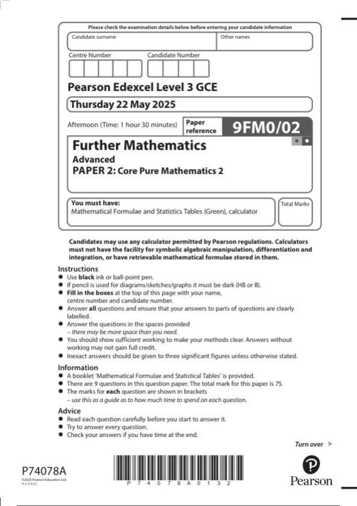 edexcel further mathematics 9fm0 02 paper 2 core pure mathematics 2 june 2025edexcel