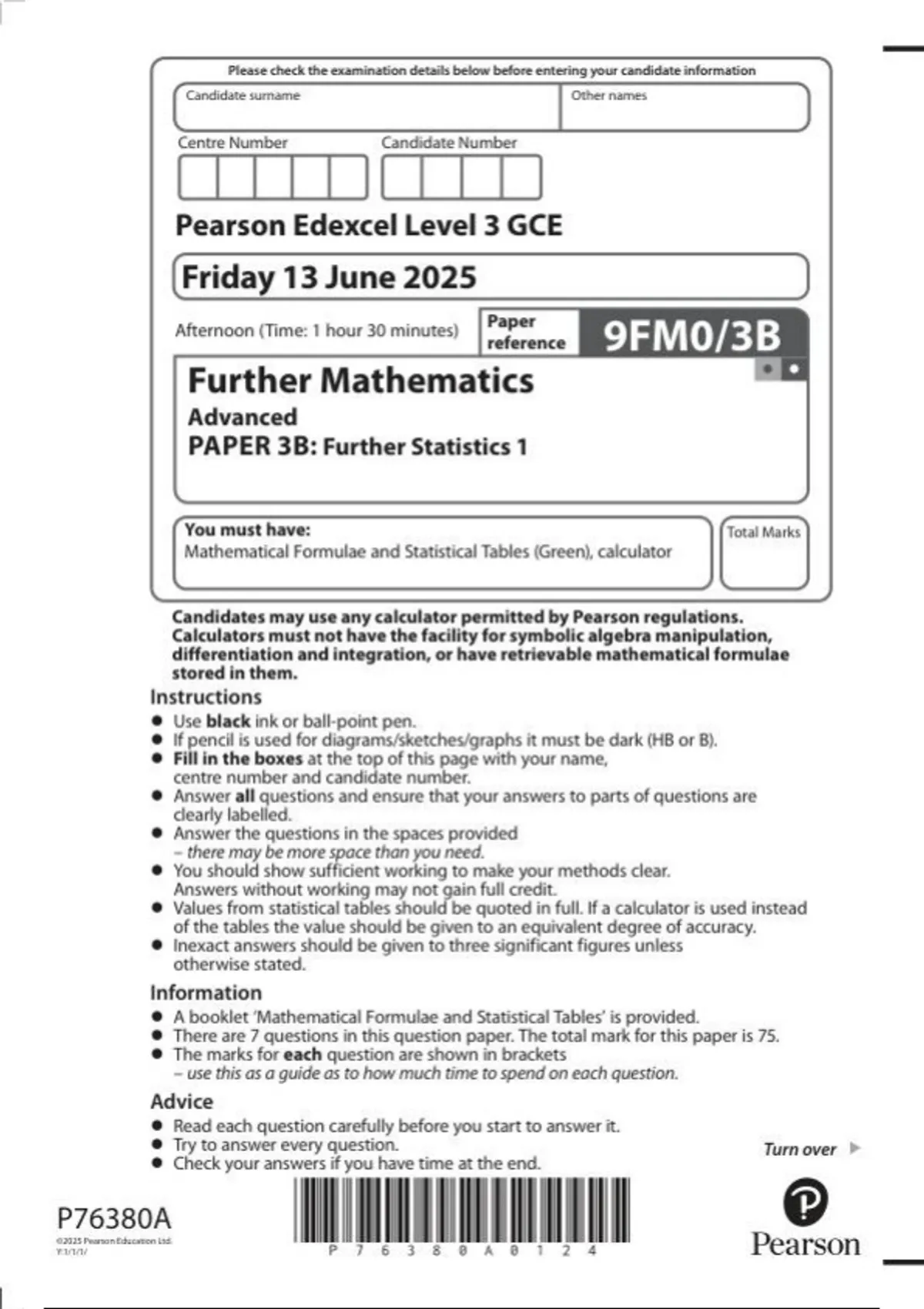 EDEXCEL further mathematics 9fm0-3b paper 3b: further statistics 1 30 june-2025.