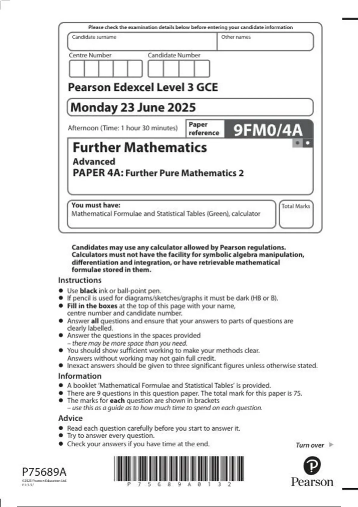 edexcel further mathematics 9fm0 4a paper 4a further pure mathematics 2 june 2025edexcel