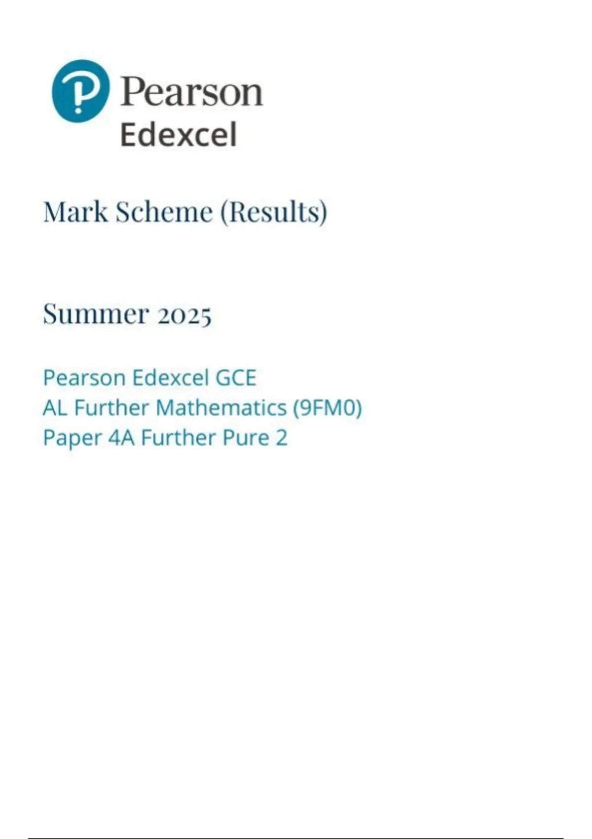 edexcel further mathematics 9fm0 4a paper 4a further pure mathematics 2 mark scheme june 2025edexcel