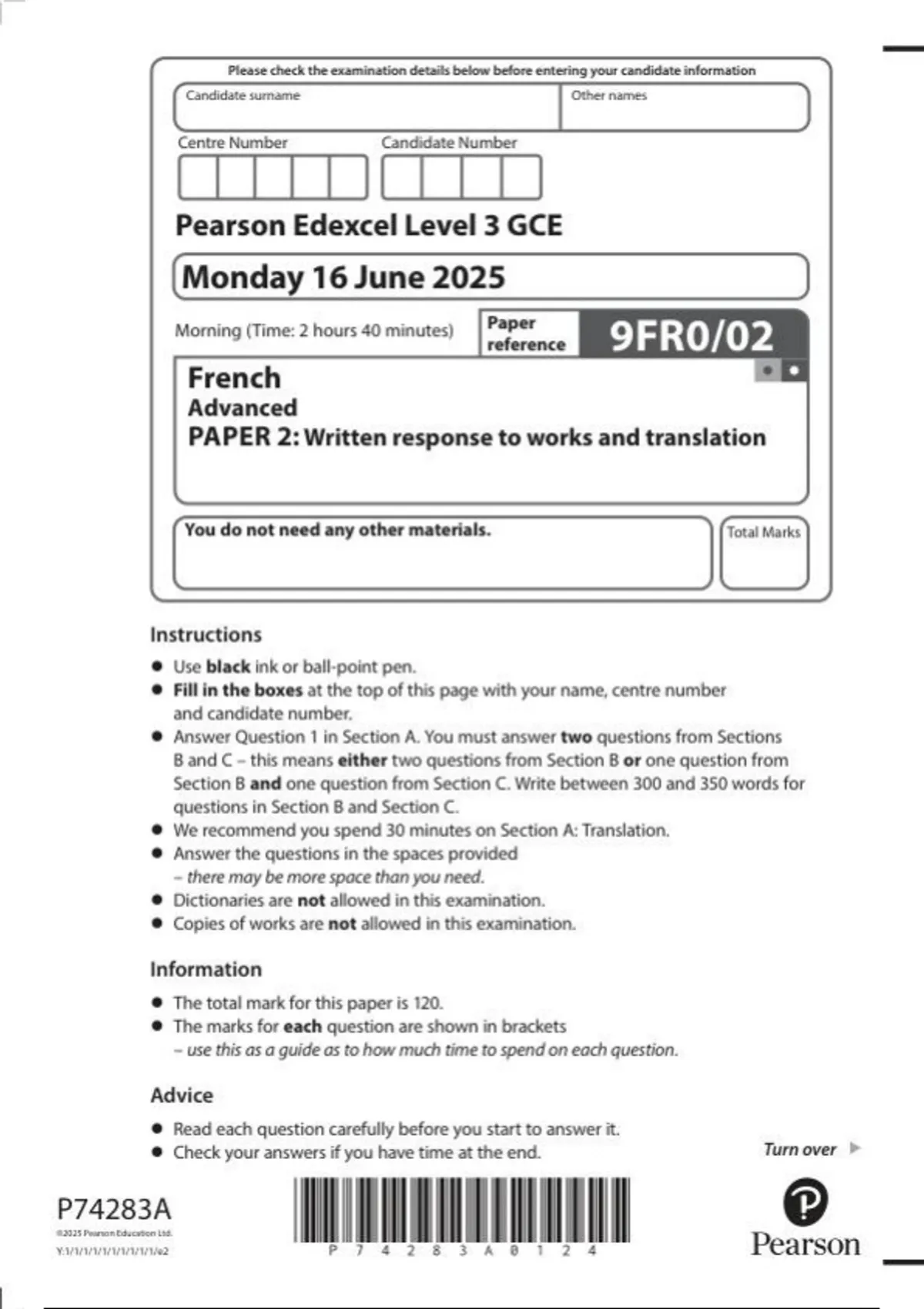 Pearson Edexcel GCE In French (9FR0) Paper 02 Written response to works and translation june-2025.